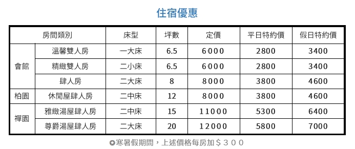 2.會館所有房型、禪園雅緻湯屋房型不提供加人服務。