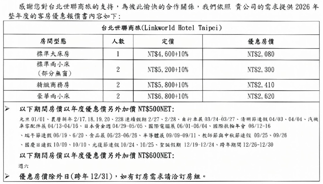 ▶︎以下期間房價以年度優惠價,另外加價NT$600NET: