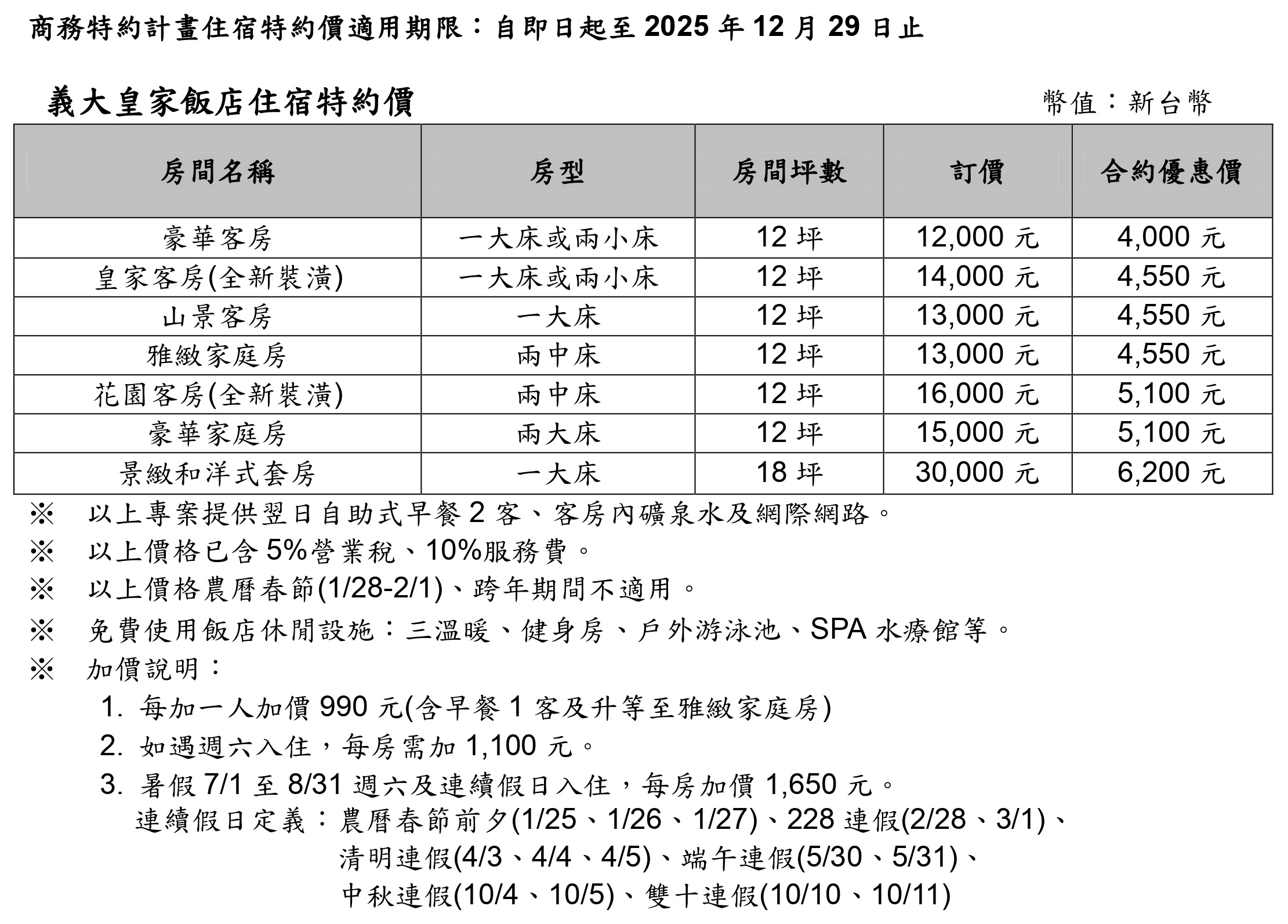 3. 暑假7/1至8/31 週六及連續假日入住,每房加價1,650元