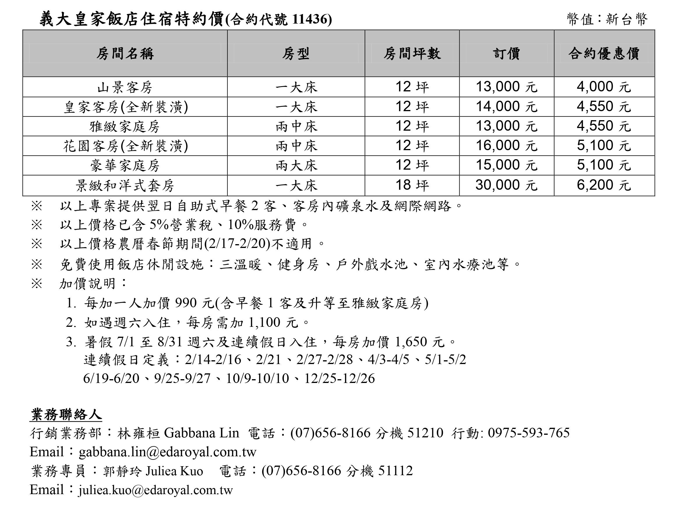✦本合約價適用於單日7間以下之訂房,若超過7間以上,請洽飯店業務人員