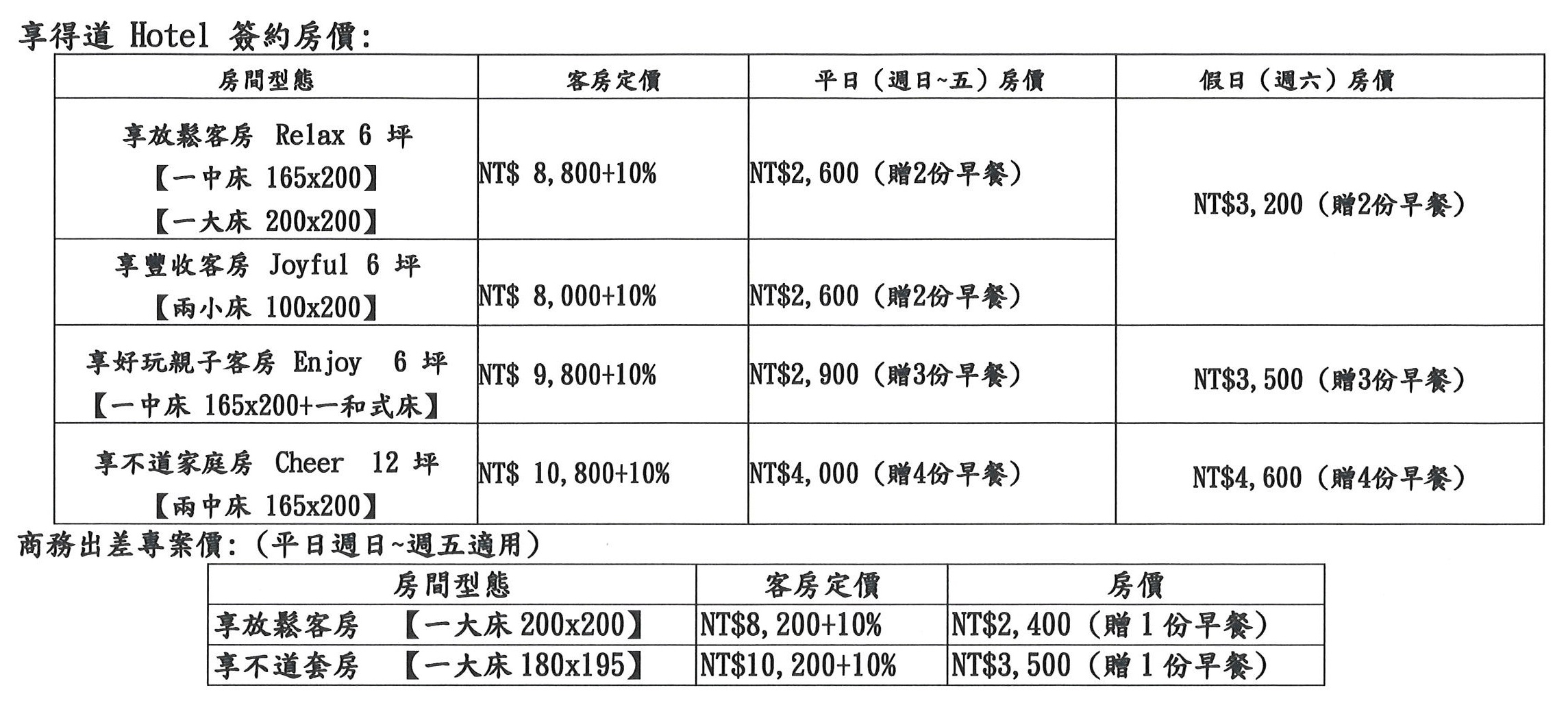 春節春假假期(依酒店定義),恕不適用合約價;連續假日、跨年期間,須以假日價加價 $300/間。