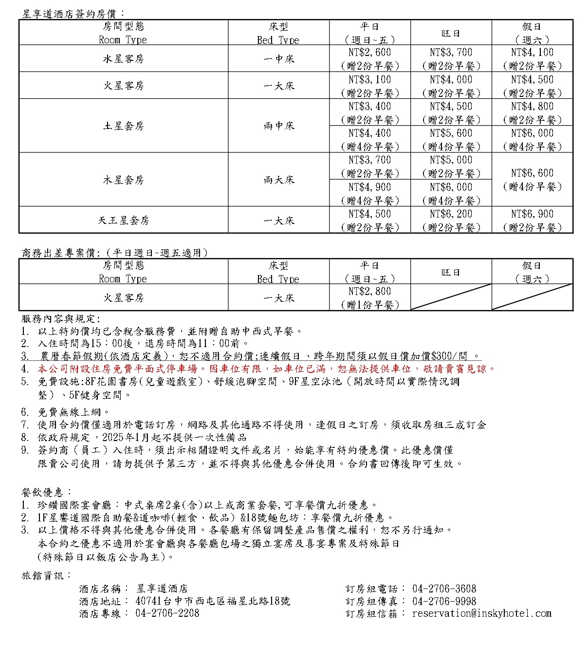 使用合約價僅適用於電話訂房,網路及其他通路不得使用。逢假日之訂房,須收取房租三成訂金