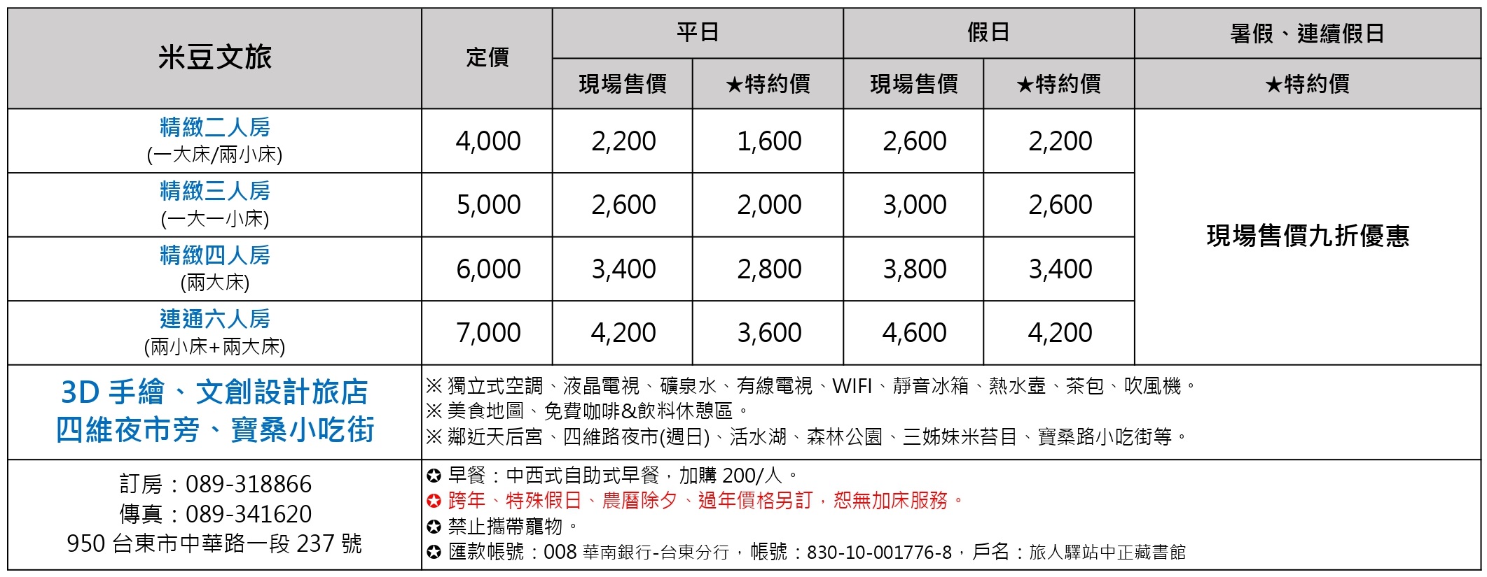 跨年、特殊假日、農曆除夕、過年價格另訂,恕無加床服務。