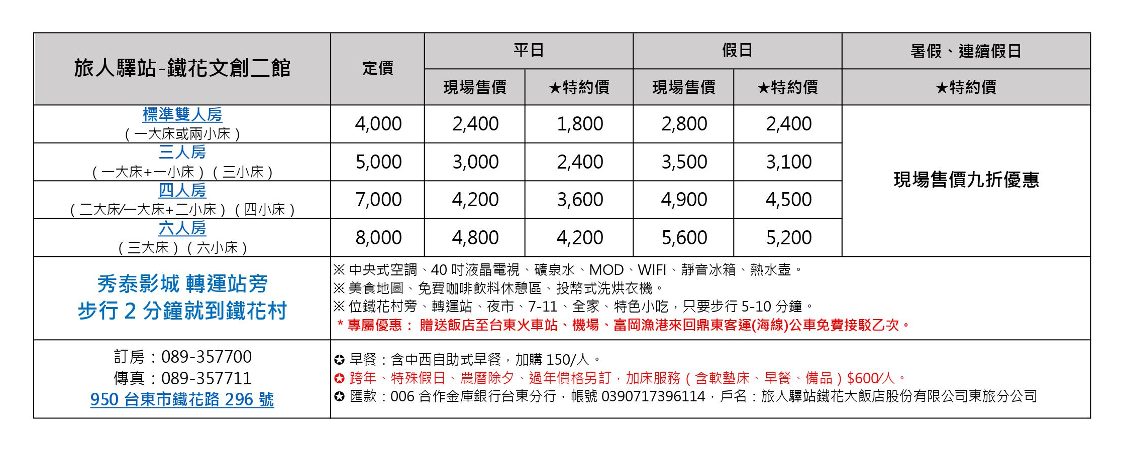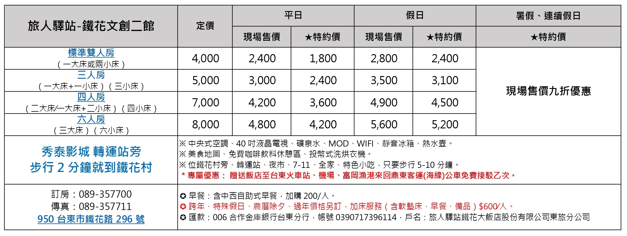 跨年、特殊假日、農曆除夕、過年價格另訂,加床服務(含軟墊床、早餐、備品)$600/人。