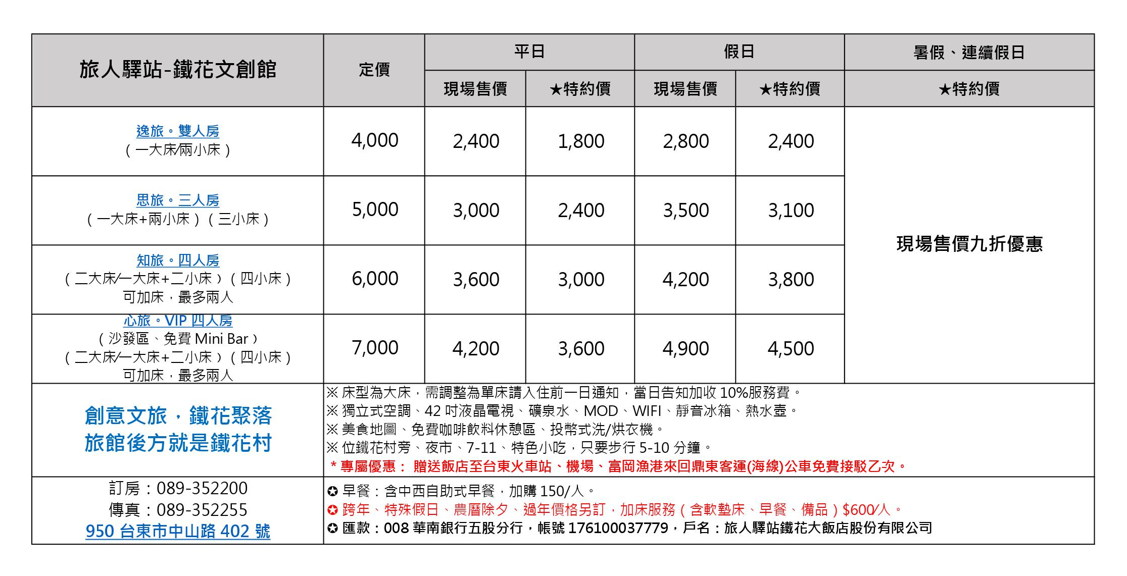 ★ 專屬優惠: 贈送飯店至台東火車站、機場、富岡漁港來回鼎東客運(海線)公車免費接駁乙次。