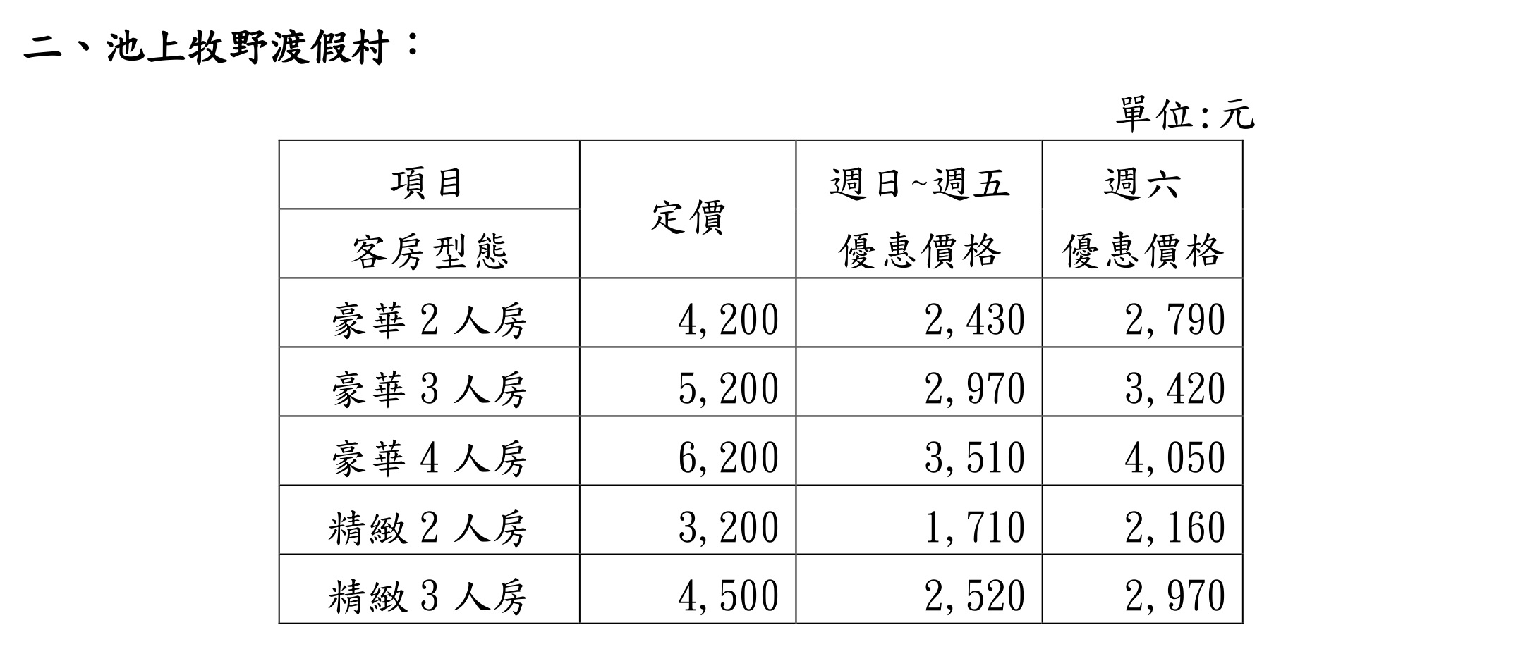 【池上牧野渡假村】 全教產會員憑卡入住各式房型優惠價格如下(即以當日房間售價9折計) 恕無法與其他住房專案及優惠合併使用。 池上牧野渡假村 地址:臺東縣池上鄉新興村110號 訂房專線:089-863105 https://www.taisugar.com.tw/resting/chinshang/index.aspx https://www.facebook.com/tscmongo/?locale=zh_TW