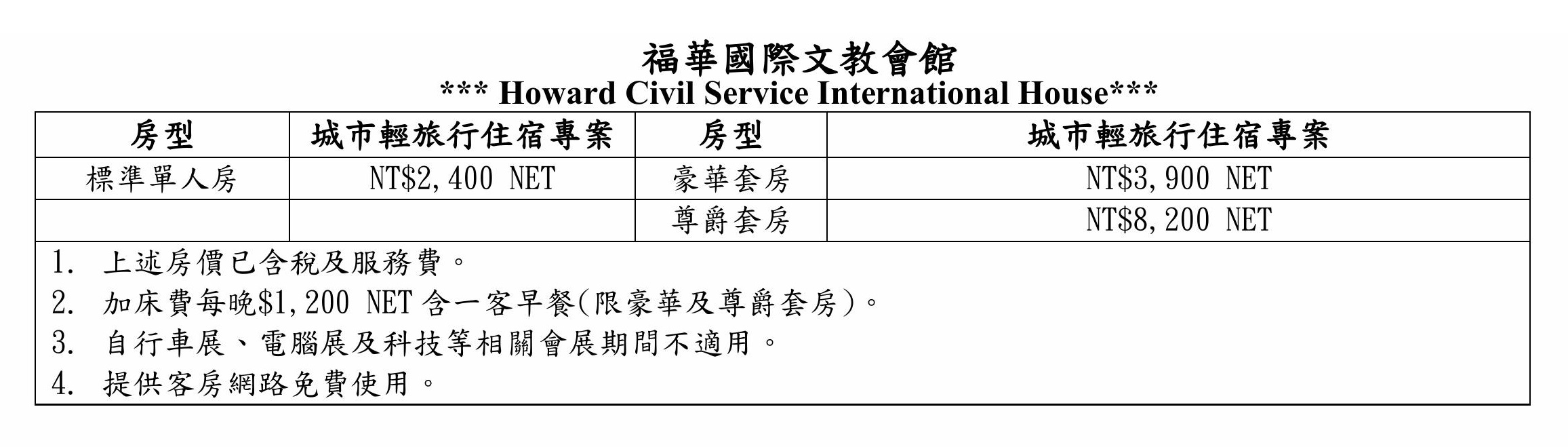 加床費每晚 $1,200 NET 含一客早餐。(限豪華及尊爵套房)。