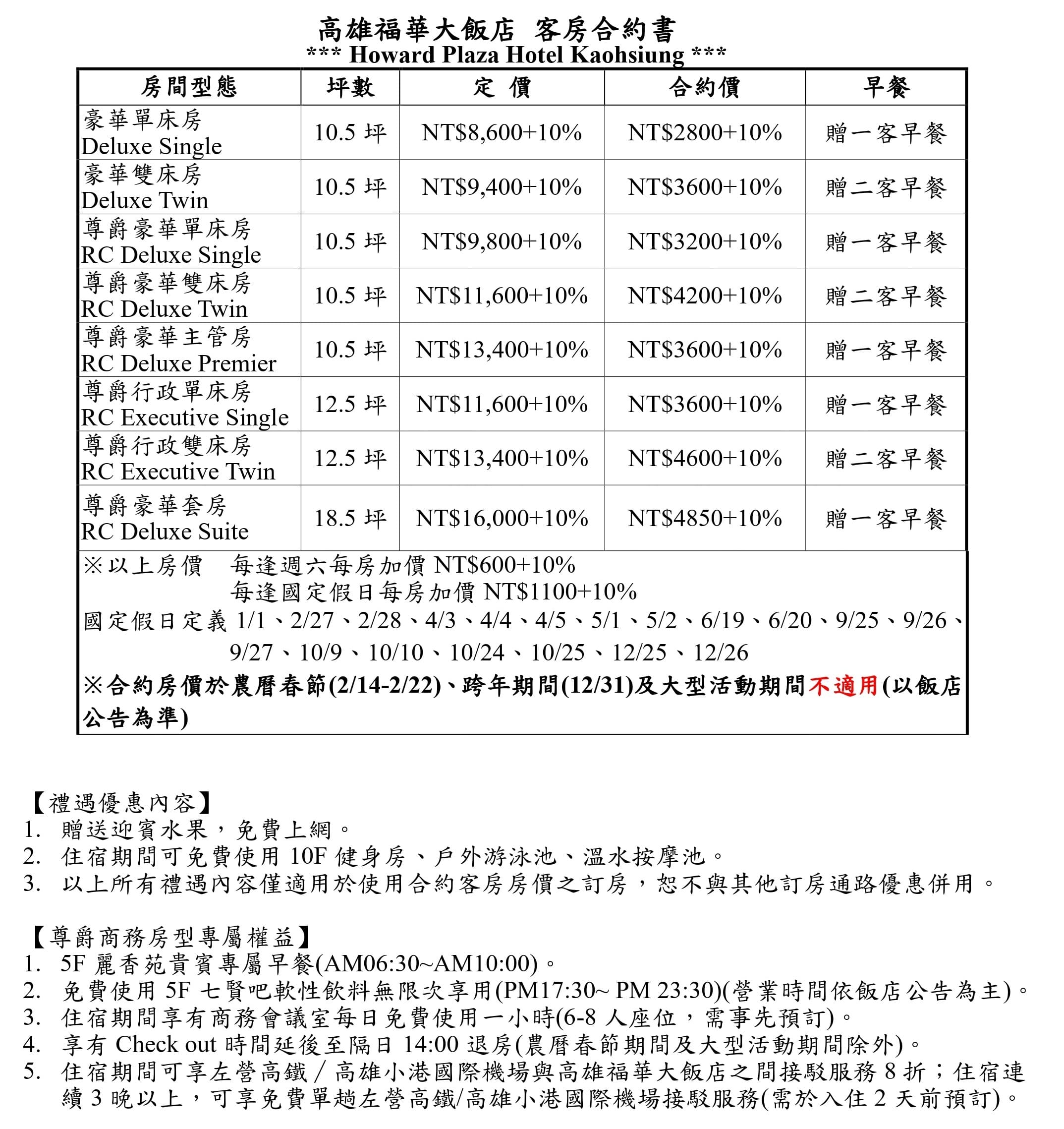 【尊爵商務房型禮遇內容】