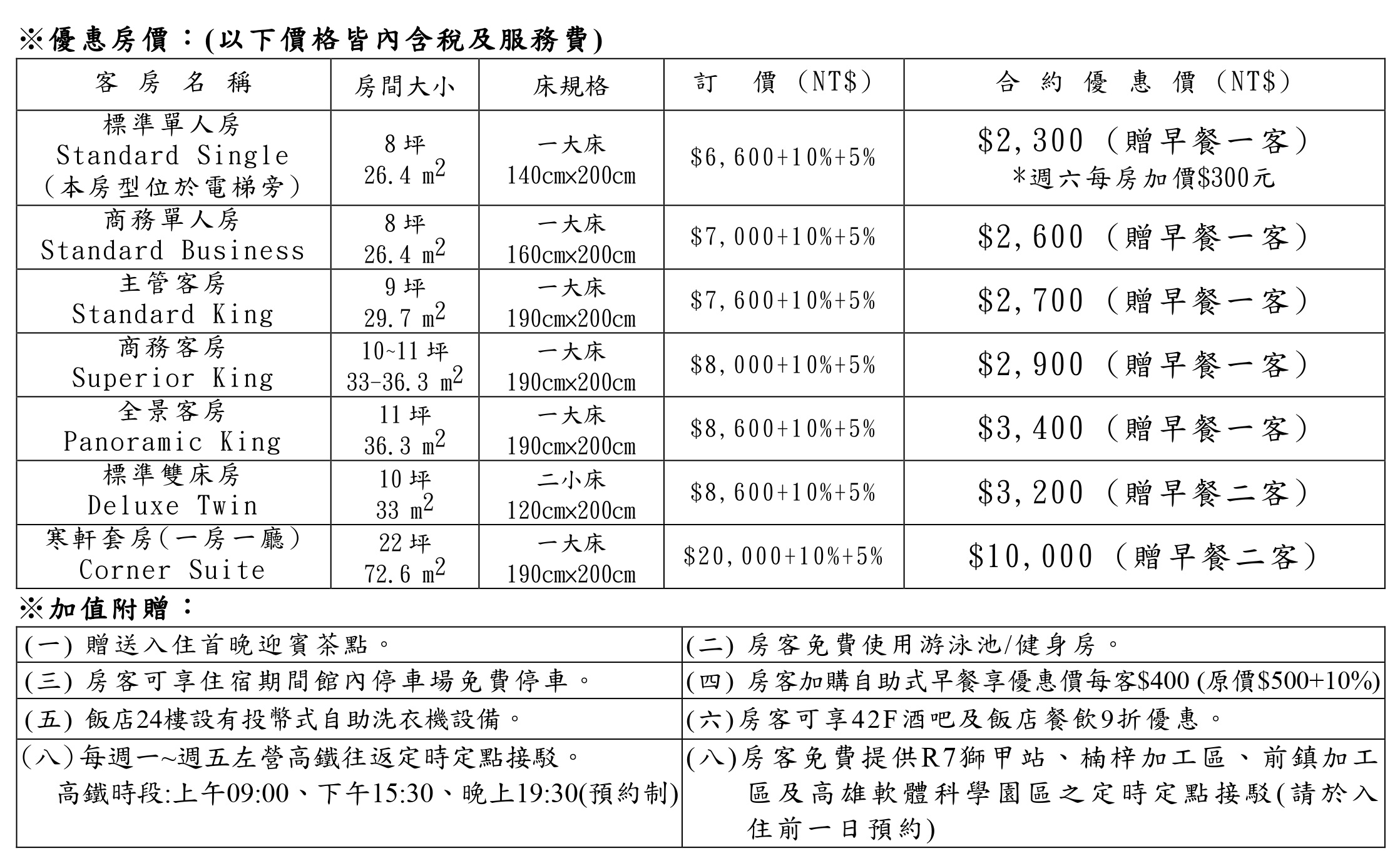 特約所載之優惠價格若逢星期六每房加價$600元、連續假期每房加價$1,000元。