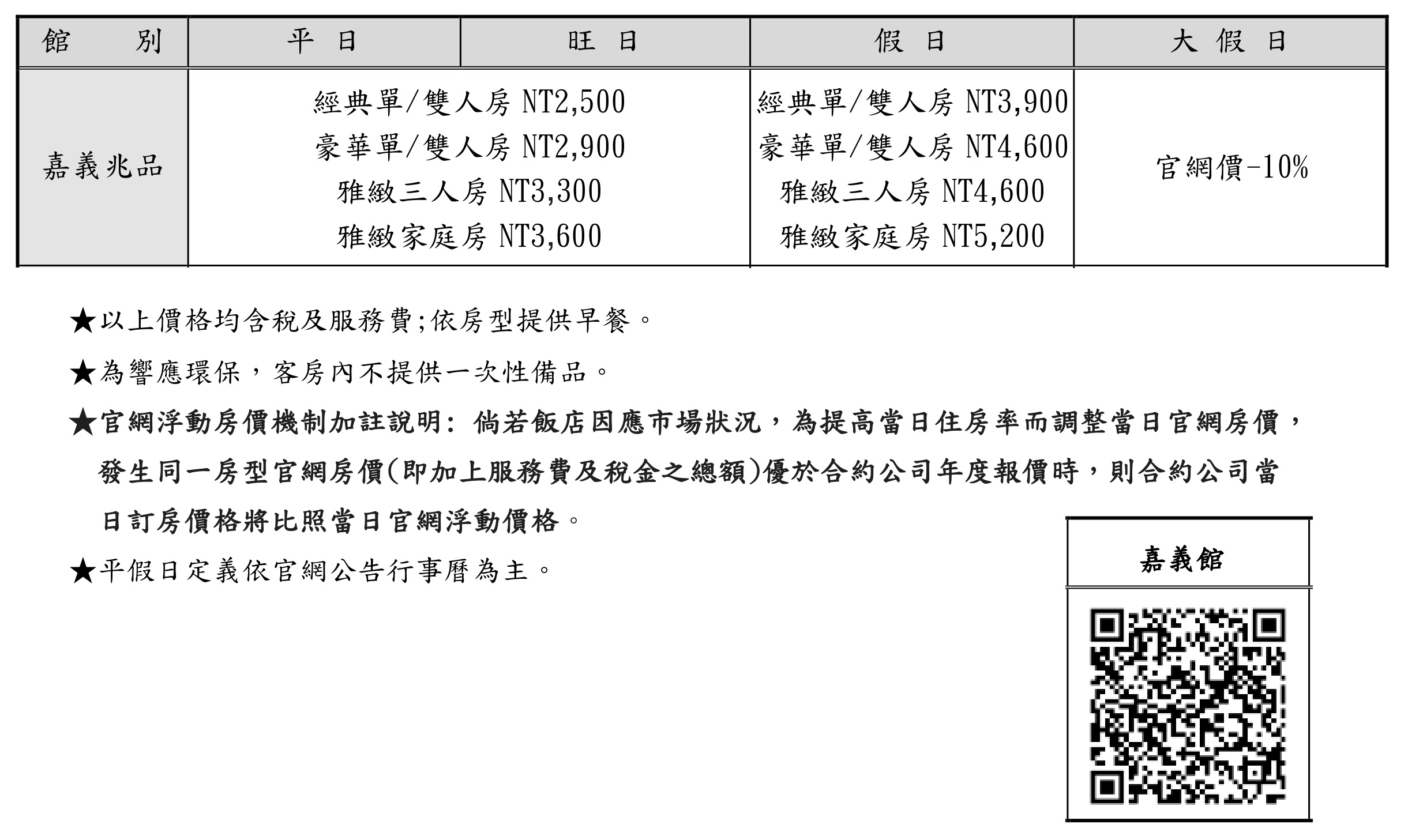 官網浮動房價機制加註說明:倘若飯店因應市場狀況,為提高當日住房率而調整當日官網房價,發生同一房型官網房價(即加上服務費及稅金之總額)優於合約公司年度報價時,則合約公司當日訂房價格將比當日官網浮動價格。