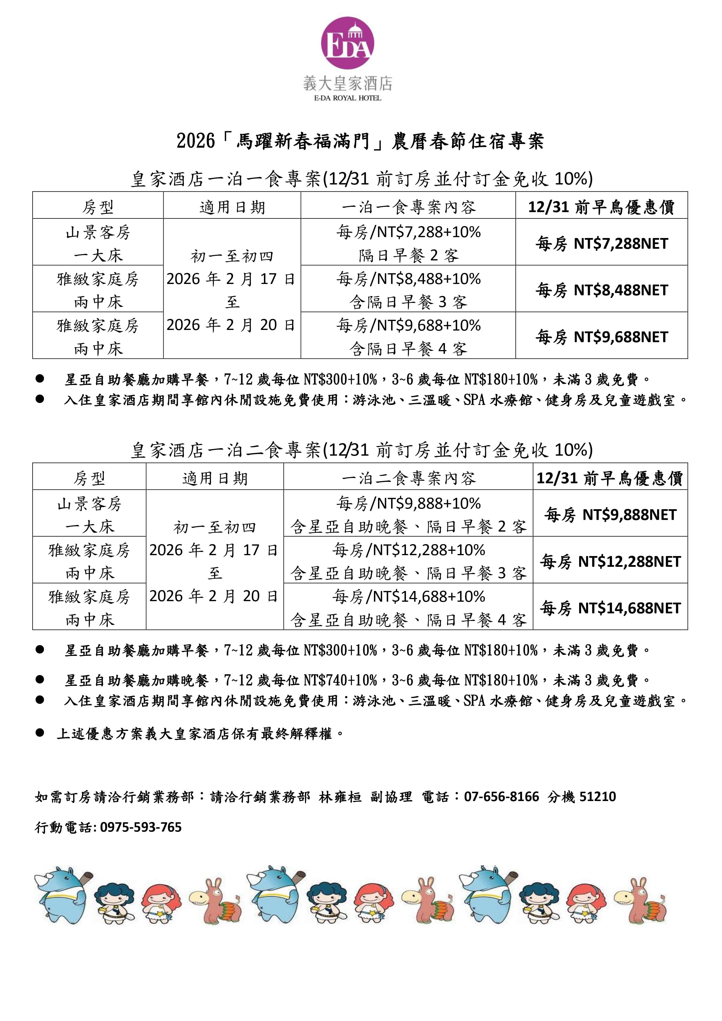 【義大皇家酒店】 全教產會員享2026年農曆春節住宿優惠 優惠專案內容請見下方公告 優惠方案義大皇家酒店保有最終解釋權。 如需訂房,請洽行銷業務部 業務副協理 林雍桓 先生 電話:07-656-8166 分機51210 業務助理 郭靜玲 電話:07-656-8166 分機51112 《義大皇家酒店》 https://www.edaroyal.com.tw/
