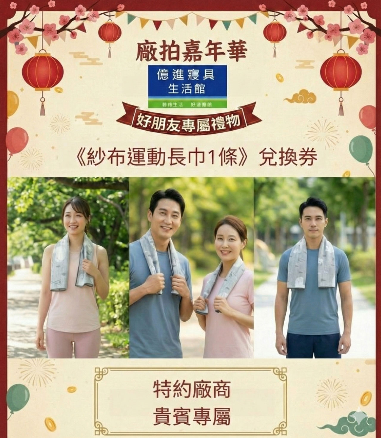活動期間出示「專屬好友券」,消費+附件的特約專屬兌換券即可兌換 紗布運動長巾 1 條(數量有限,送完為止)。