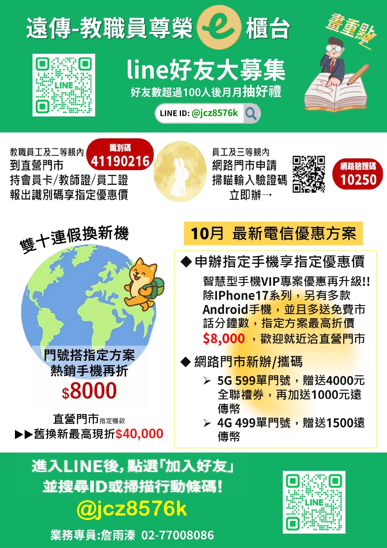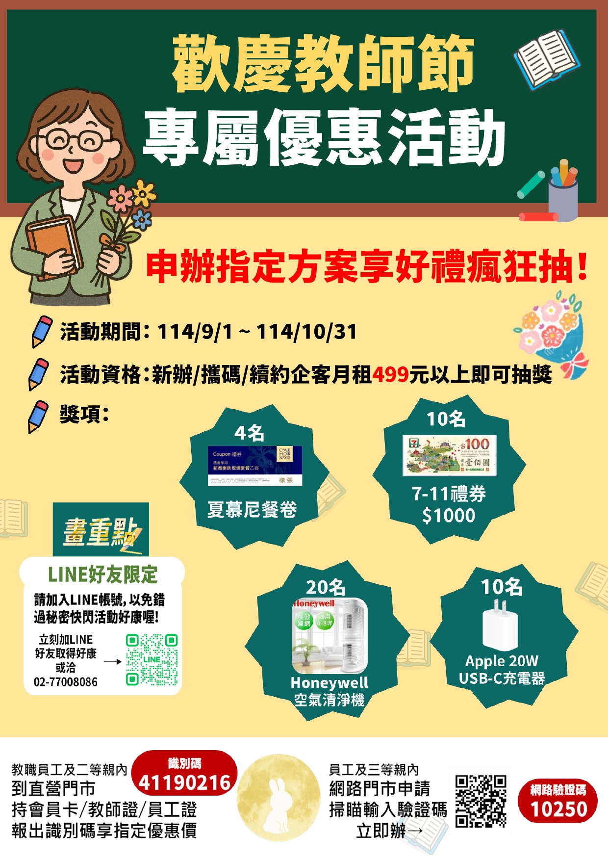 (三)教師節優惠活動:申辦實收月租費499以上方案者,即享教師節抽獎活動