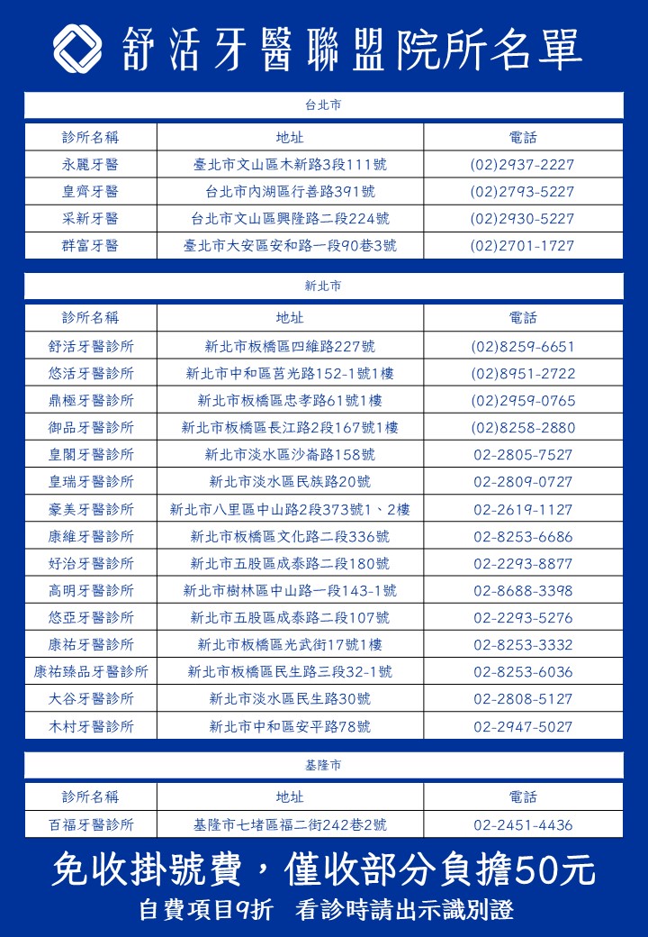 舒活牙醫聯盟牙醫各診所名單、診所資訊如下
