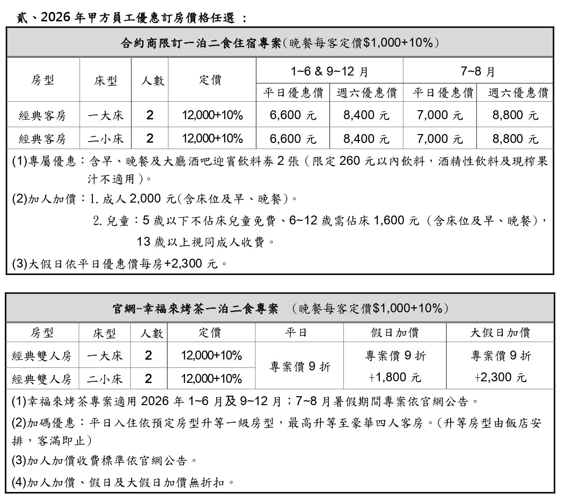 一、以上房價已含10%服務費。8間以上訂房需求請洽詢業務部訂房