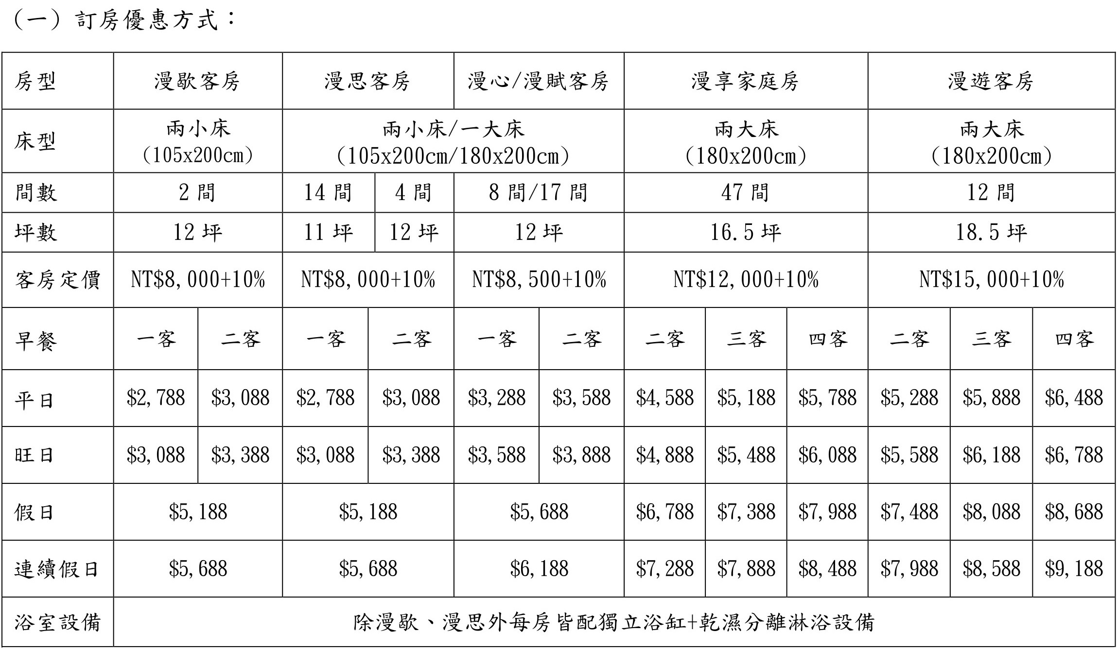 3. 假日及連續假日:漫歇客房、漫思客房及漫心/漫賦客房,以上房型僅提供雙人入住房價。