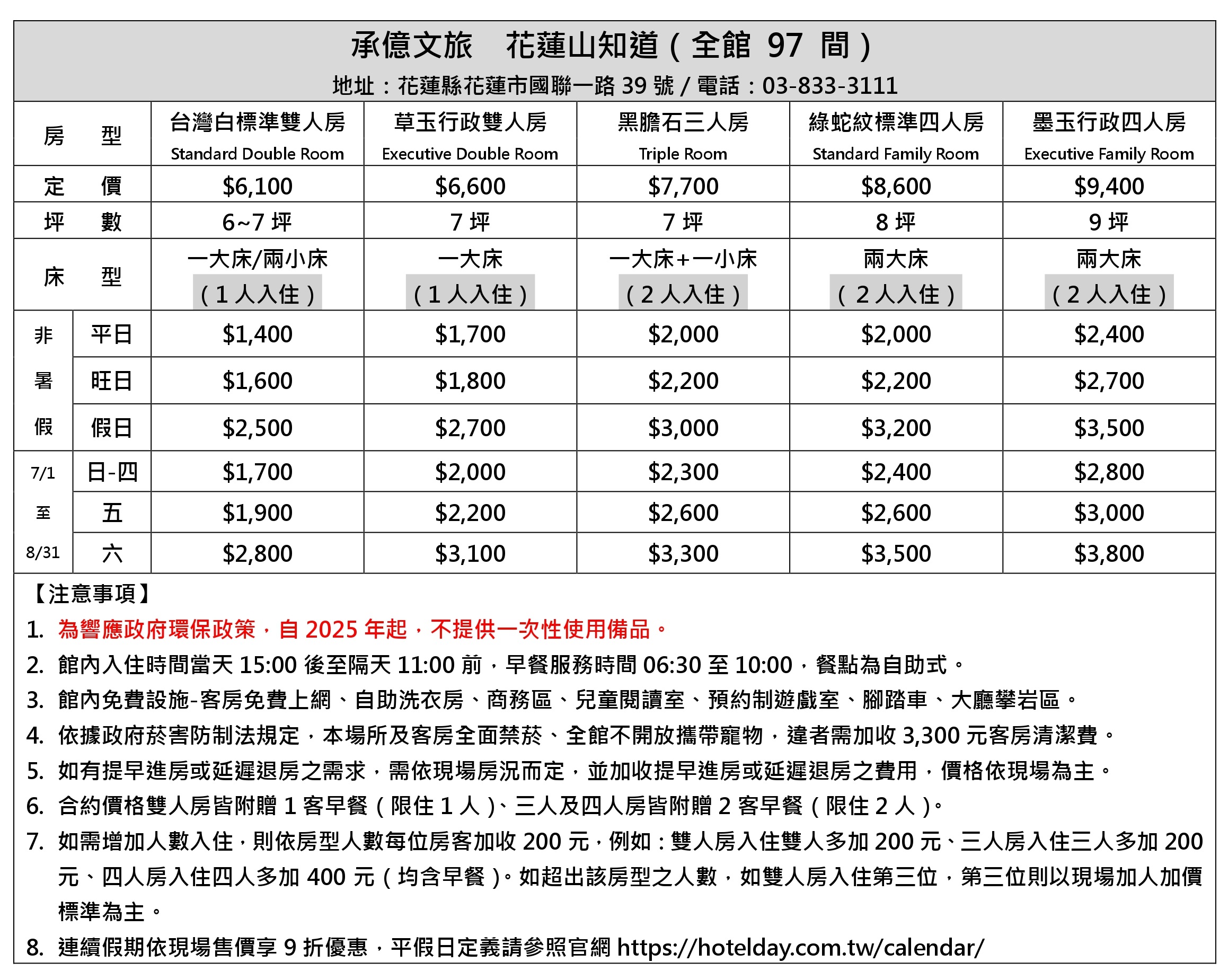 4. 取消訂房:敬請於入住14天前以電話告知,否則依觀光局個別旅客訂房定型化契約比例酌收取消費用