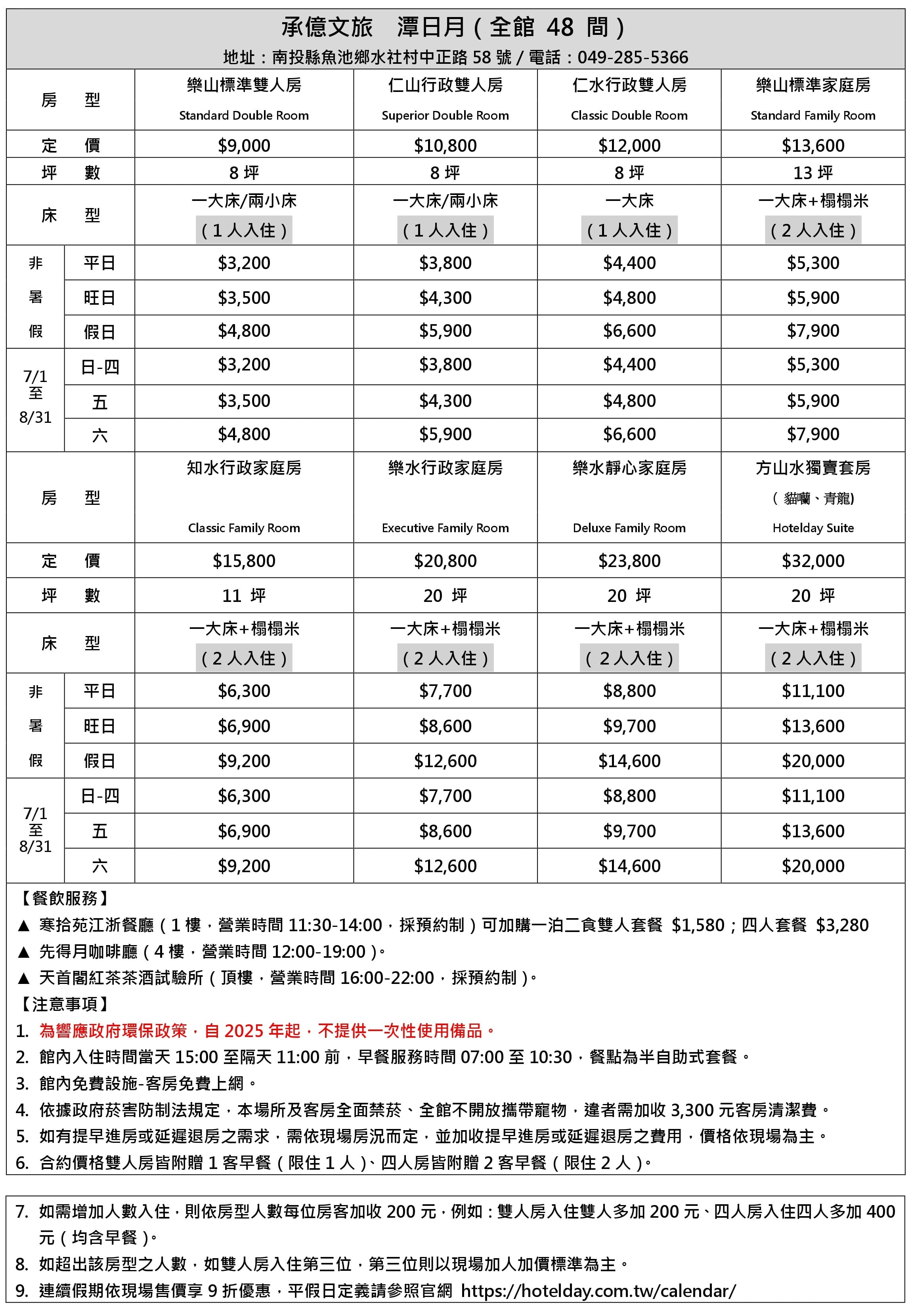8. 入住時間及退房時間依官網公告為主,若延遲退房將額外酌收費用。