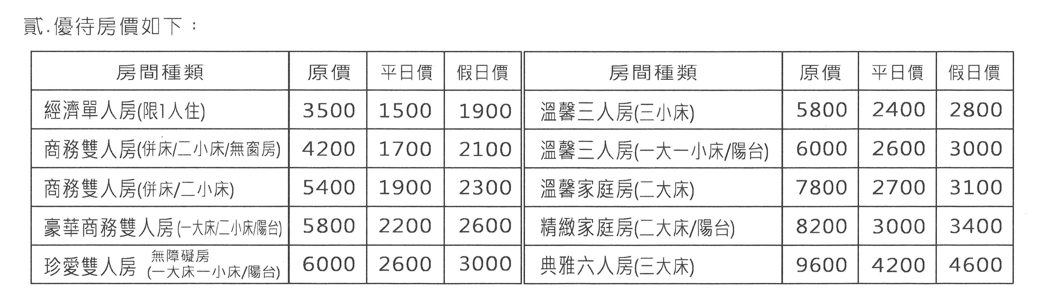 二、房型簽約廠商所屬會員,憑全教產會員福利卡住宿得享有優待。