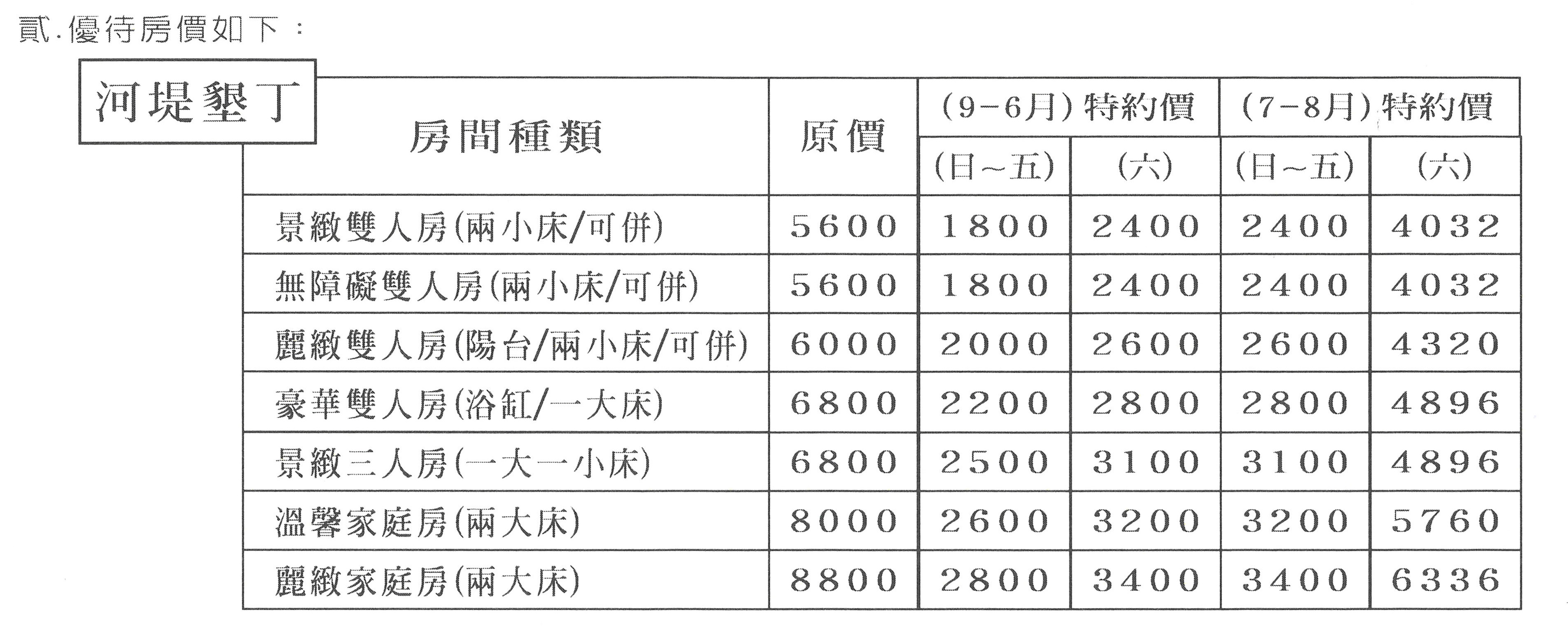 八、以上房型報價不適用「異業聯合行銷會員卡、聯合住宿券」住宿訂房,亦不可與其他優惠合併使用。