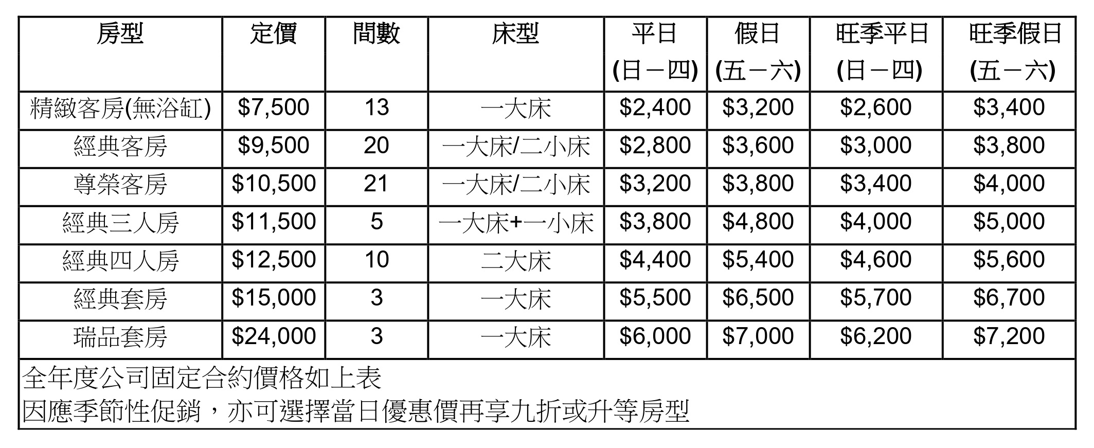1. 房價均包含早餐,5%營業稅及 10%服務費。