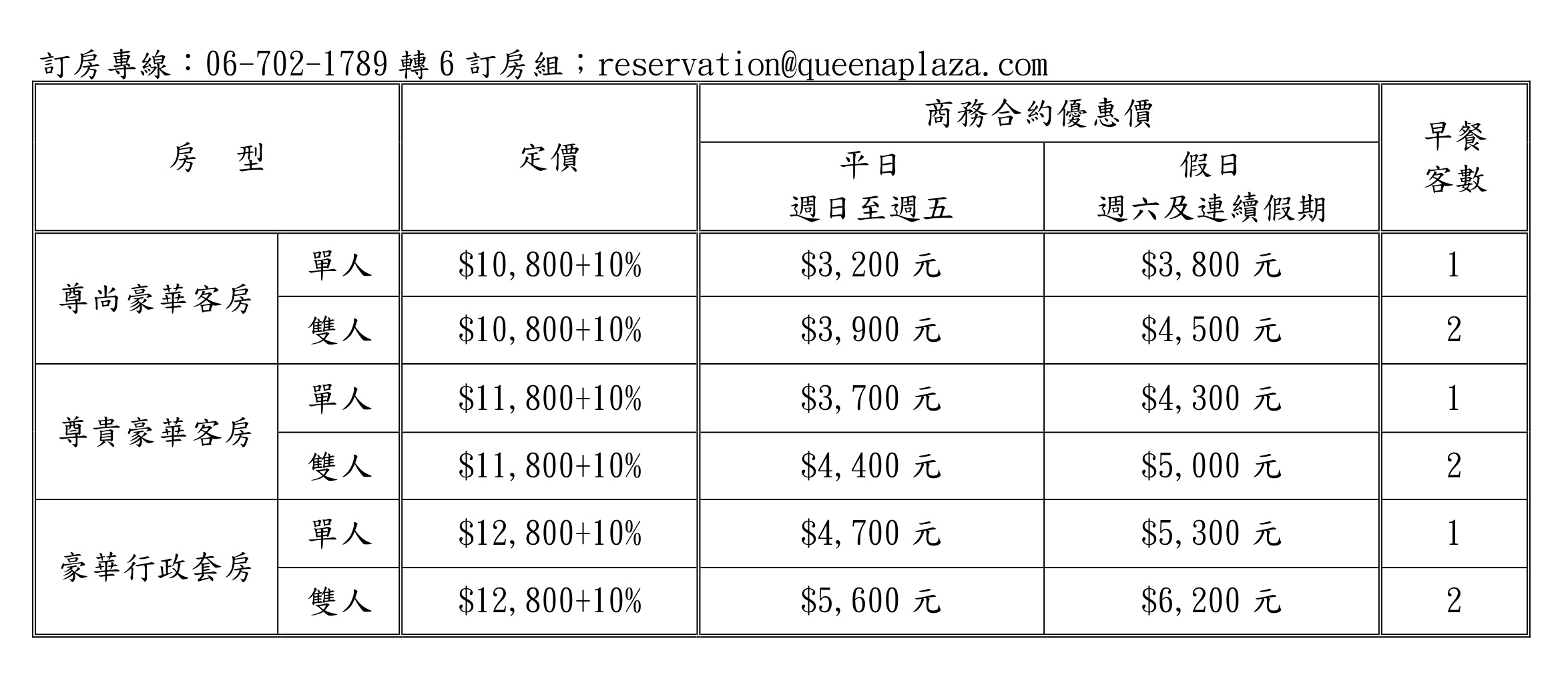 1. 優惠價格已含5%營業稅及10%服務費;加人 NT$1,400元(含1客早餐)。