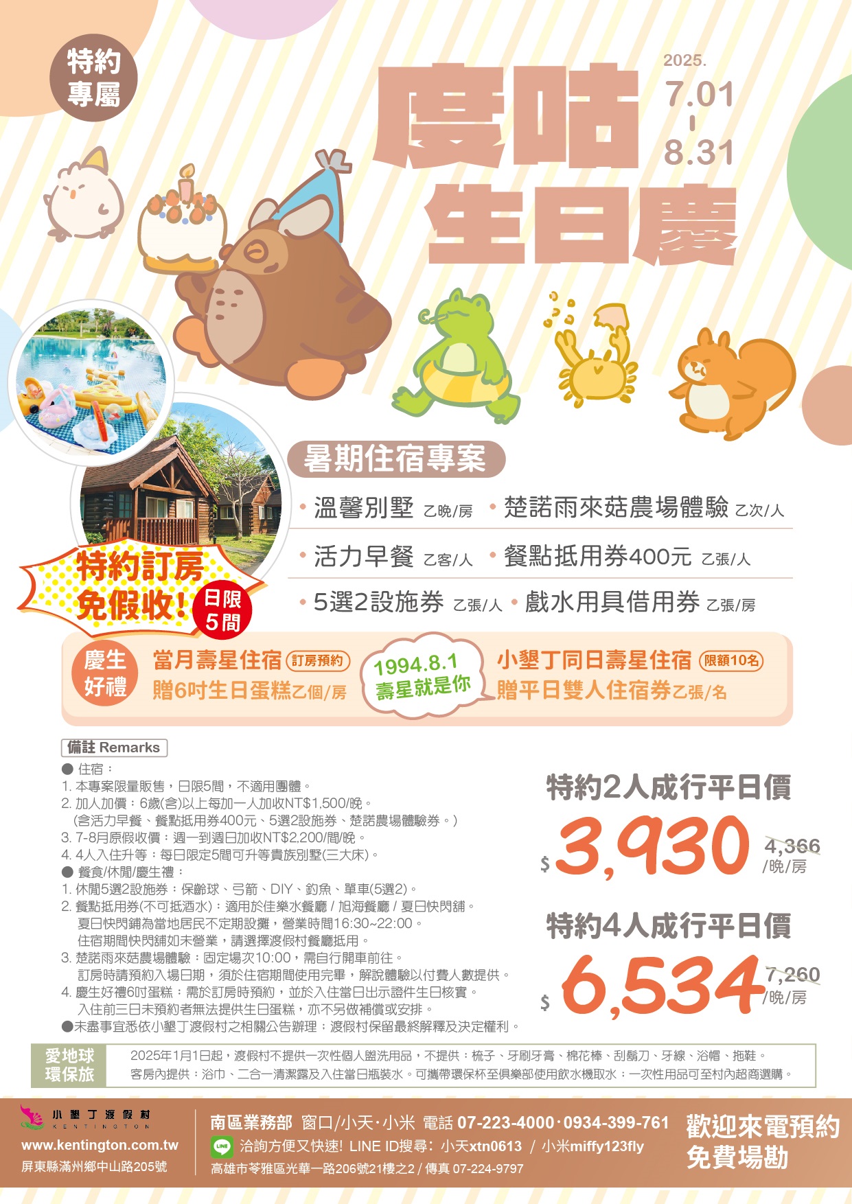 小墾丁同日壽星住宿 贈平日雙人住宿券 乙張/名 限額10名