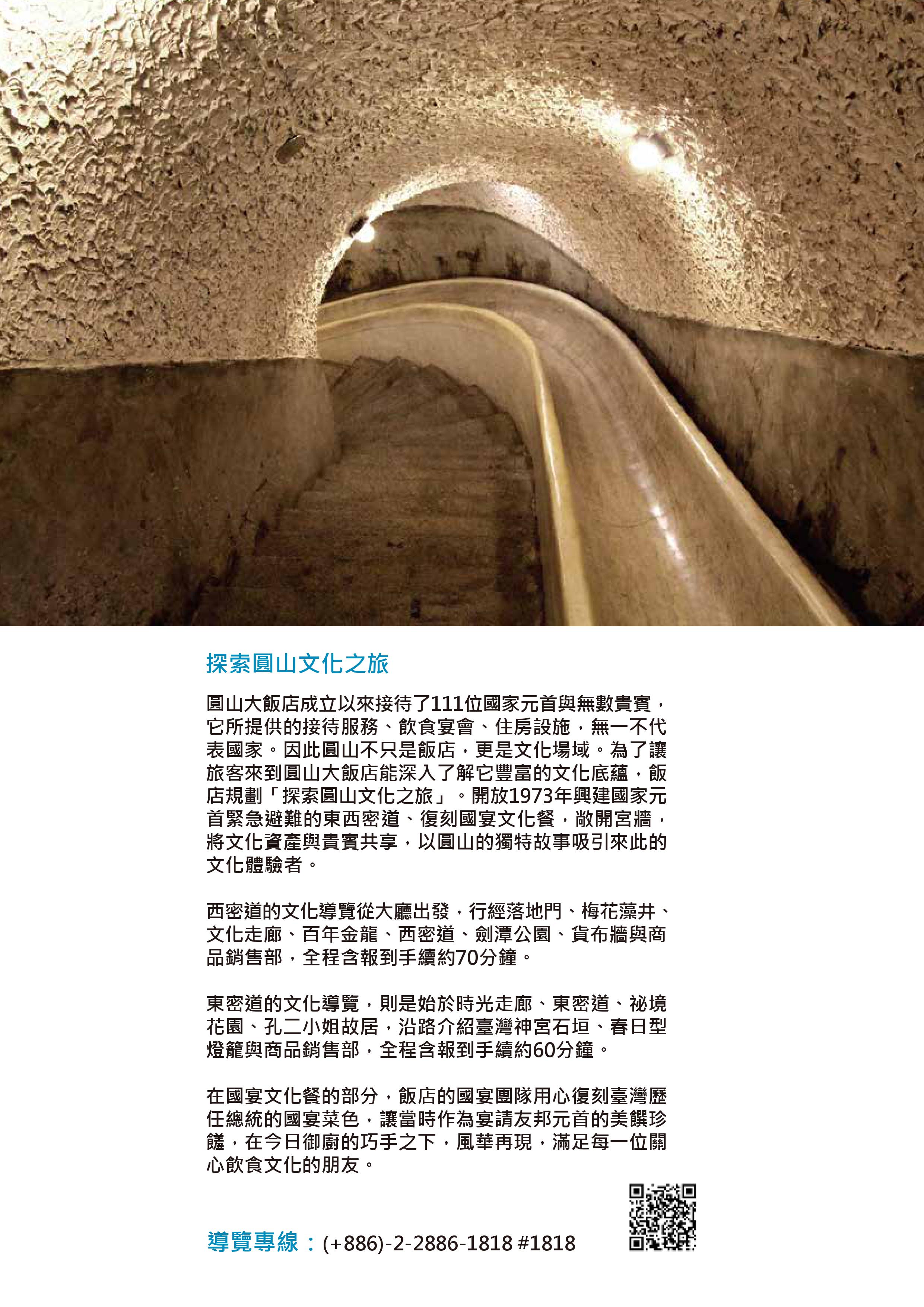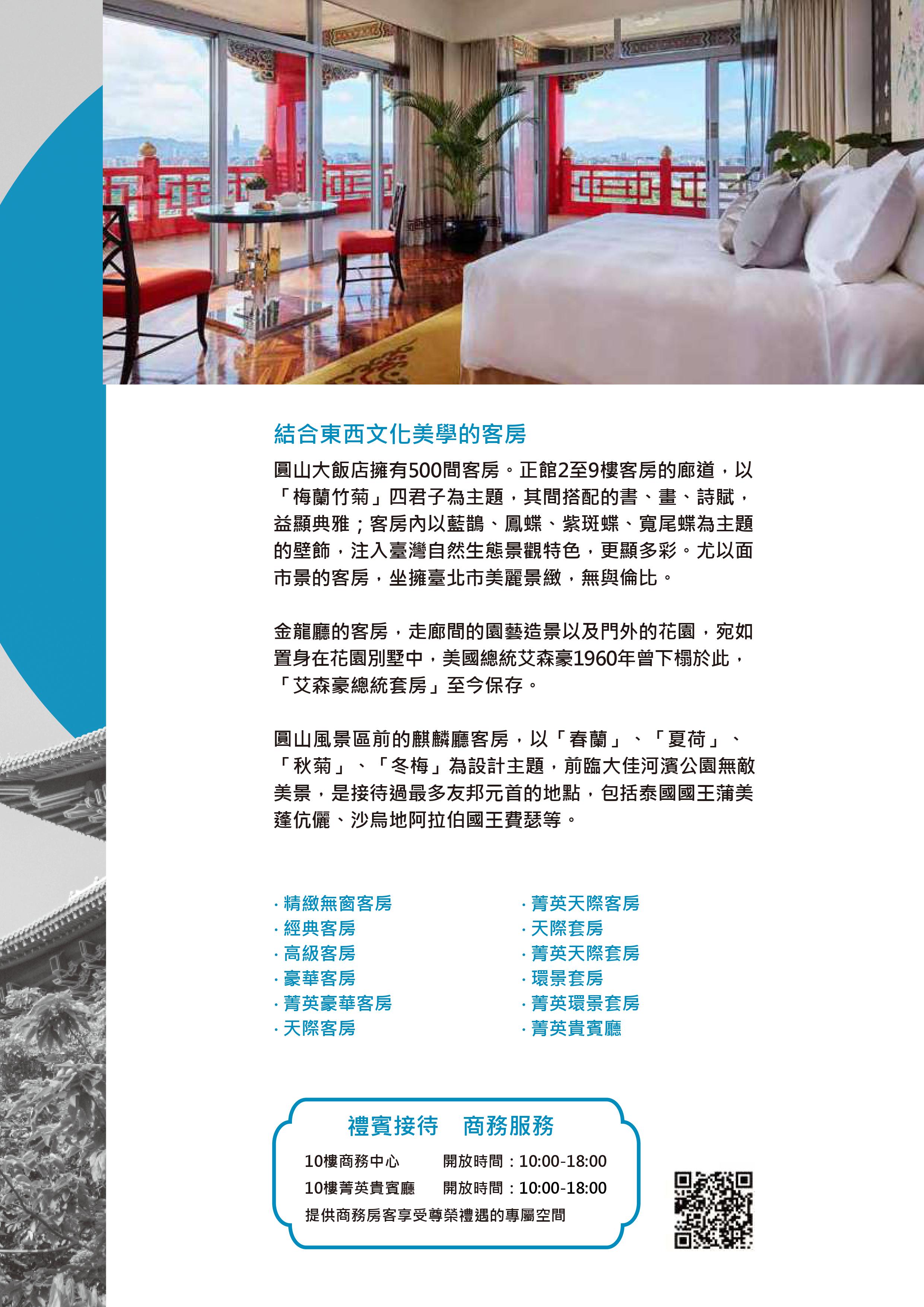 ※入住高級客房以上房型之貴賓,加贈密道導覽(依入住人數提供)及使用10樓菁英貴賓廳會議室1小時(需提前預約)。