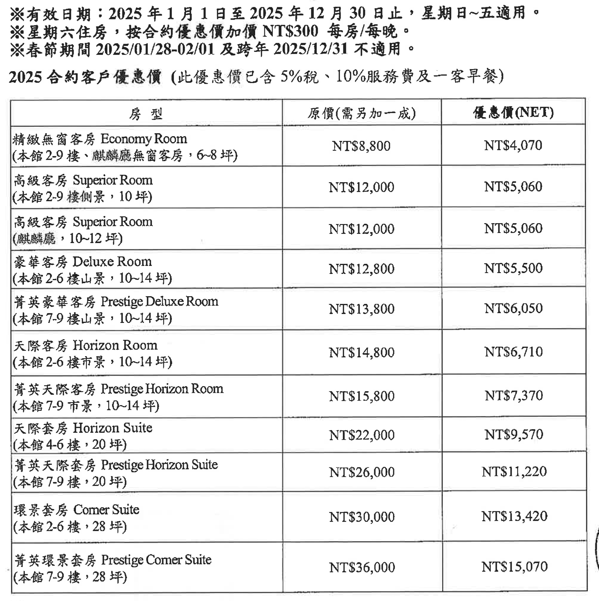 ※星期六住房,按合約優惠價加價NT$300 每房/每晚。