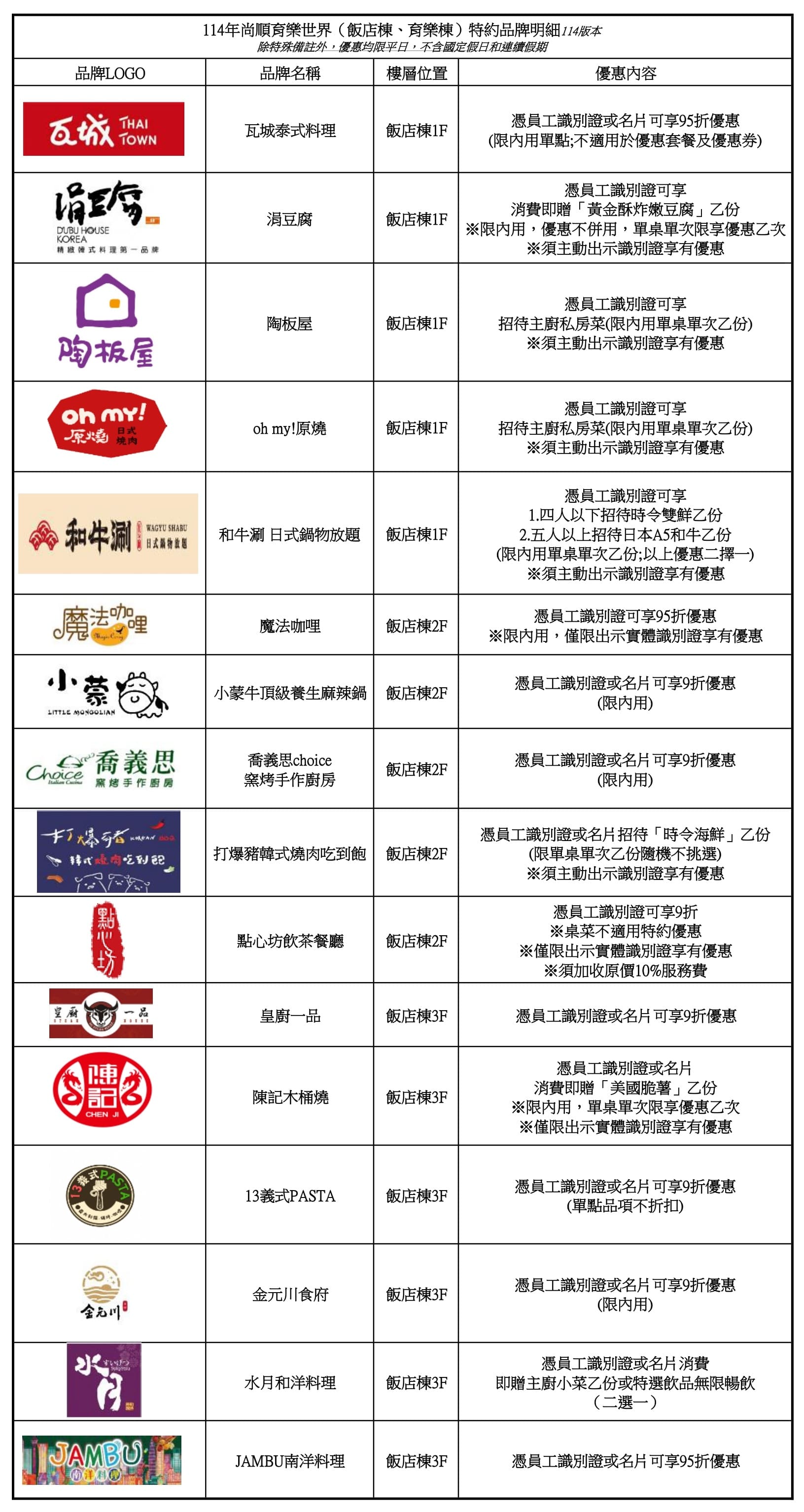 詳細優惠內容及配合品牌,以尚順育樂世界提供之配合特約專櫃明細為準