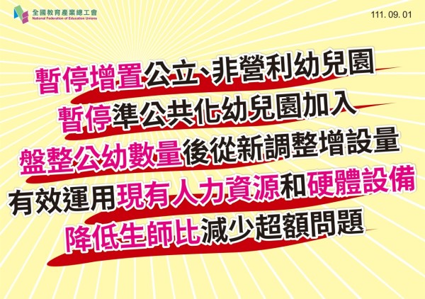 【全國教育產業總工會】建議政府暫停增置公立、非營利幼兒園、暫停準公共化幼兒園加入,在盤整公幼數量後,依不同地區之需求來從新調整增設量,並期許現有人力資源和硬體設備量能可有效運用,並建議將就學補助等預算編列改為降低生師比,減少超額問題,同時應足量補充特教人力支援(特教助理員)或補助現有人力津貼(提高教保費)等,全面提升幼教品質。