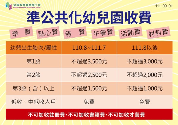 【全國教育產業總工會】接獲會員教師反應公立幼兒園招生不佳,尤其今年8月起準公共幼兒園第一胎的收費每月不超過3000元、第二胎每月不超過2000元、第三胎每月不超過1000元,其搶學生效應對於公幼之衝擊可能會更明顯。