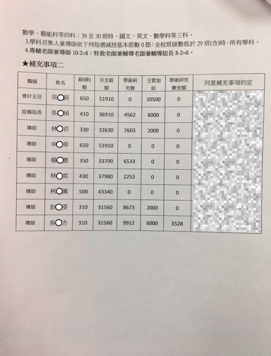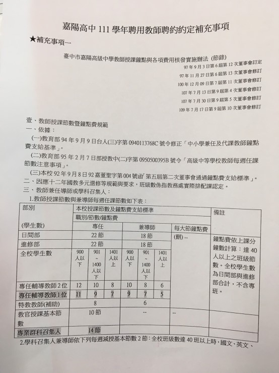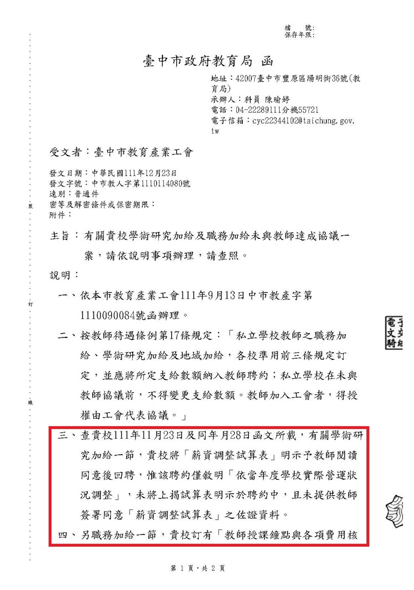 之後,依據地方工會反應,教育局終於有動起來,但是臺中市政府教育局111年12月23日中市教人字第1110114080號函,教育局僅要求嘉陽高中「於111年12月30日前,就學術研究加給及職務加給與教師達成協議,並檢附同意書影本報局憑辦。未依限改善者,本局將依『臺中市政府教育局獎勵補助私立高級中等學校經費實施要點』相關規定,列為本市私立高級中等學校獎勵補助之參酌。」結果,嘉陽高中於111年12月26日起竟開始要求並強迫校內教師於聘約約定補充事項簽名同意(如附件)。