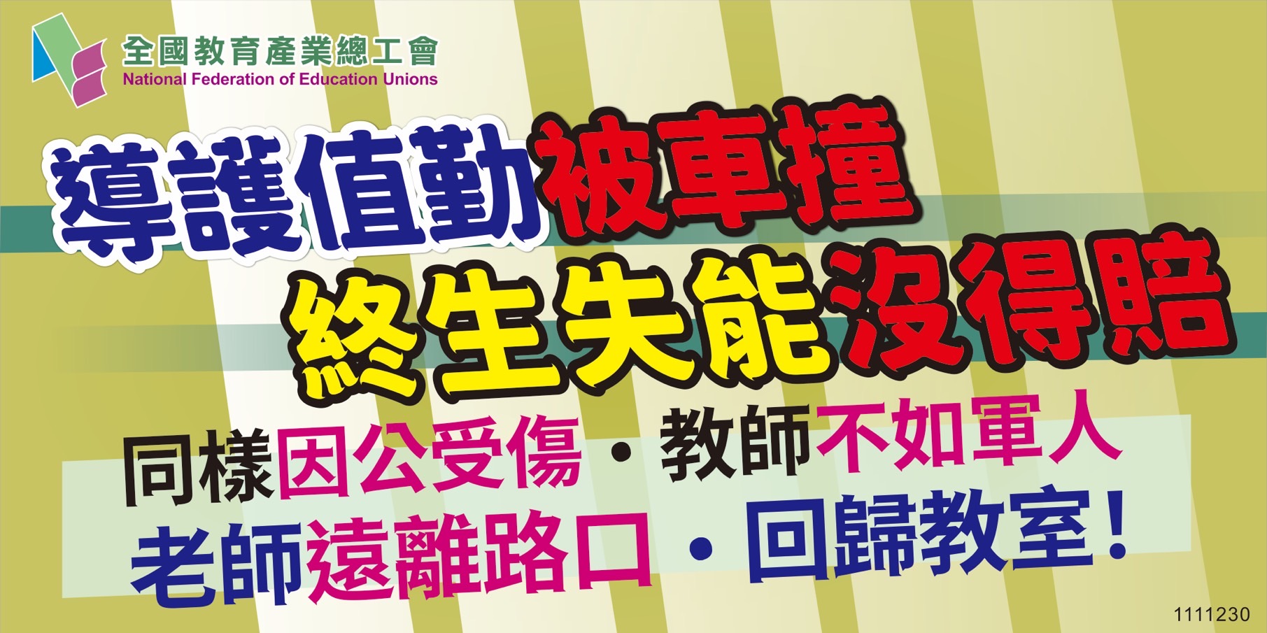 高雄市鳳翔國中梁老師導護執勤被車撞滿周年,日前確定終生失能、不能從事任何工作,全國教育產業總工會【全教產】當初的呼籲教育部要重視也滿周年了,教育部早已忘記;一年來,部長未曾探視因公受傷的梁老師,教育部、衛福部相關人員未曾出席所有協調會。據知教育部曾於2月召開唯一的檢討會,竟是檢討別人,未檢討自己,也未曾檢討教師因公受傷的後續配套措施。