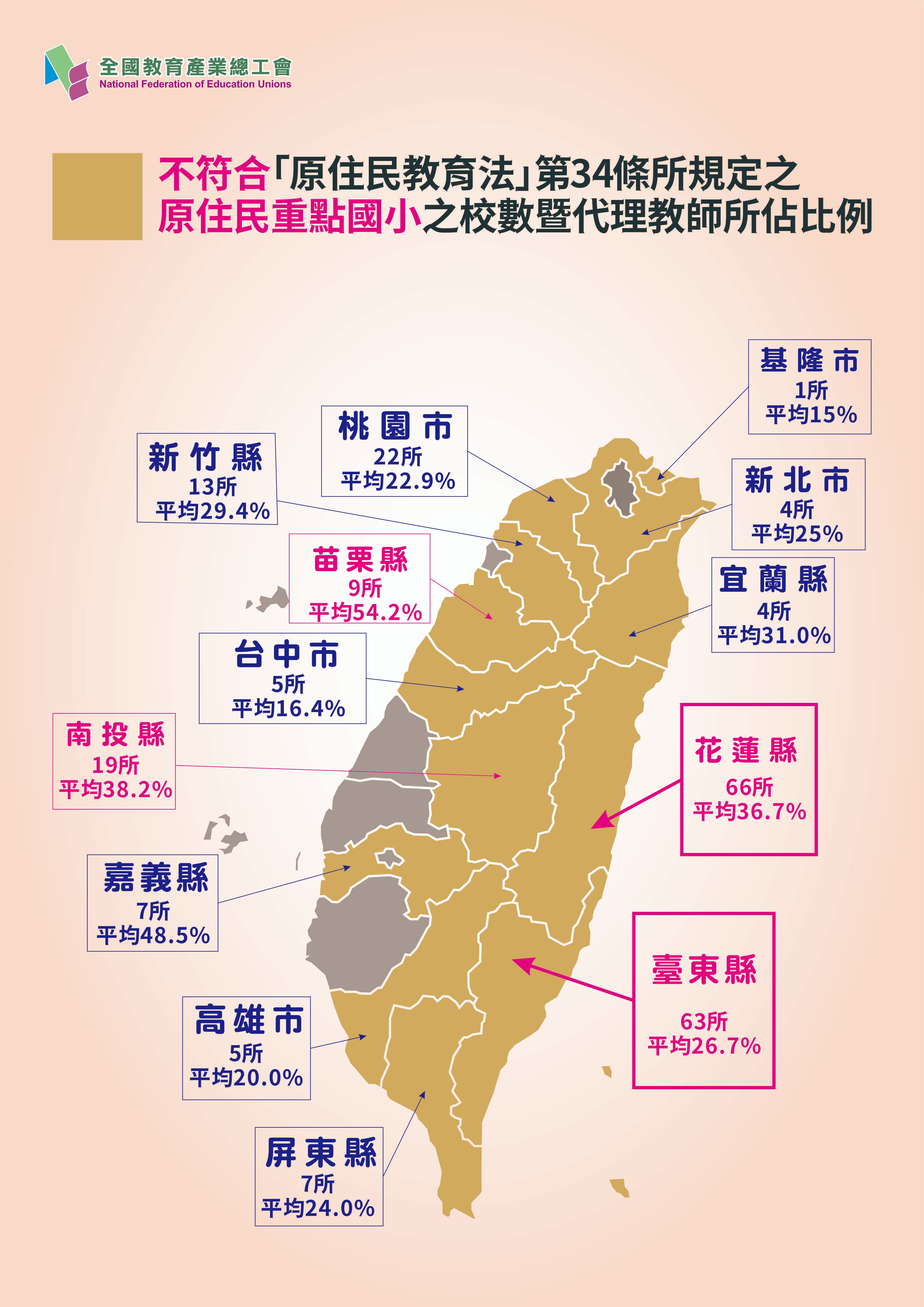 經統計,不符「原住民族教育法」34條規定的原住民重點國小有225所:計花蓮縣66所、臺東縣63所、桃園市22所、南投縣19所、新竹縣13所、苗栗縣9所、嘉義縣7所、屏東縣7所、臺中市5所、高雄市5所、新北市4所、宜蘭縣4所、基隆市1所。這些原住民重點國小之代理教師比例平均分別為:花蓮縣36.7%、臺東縣26.7%、桃園市22.9%、南投縣38.2%、新竹縣29.4%、苗栗縣54.2%、嘉義縣48.5%、屏東縣24.0%、臺中市16.4%、高雄市20.0%、新北市25.0%、宜蘭縣31.0%、基隆市15%。