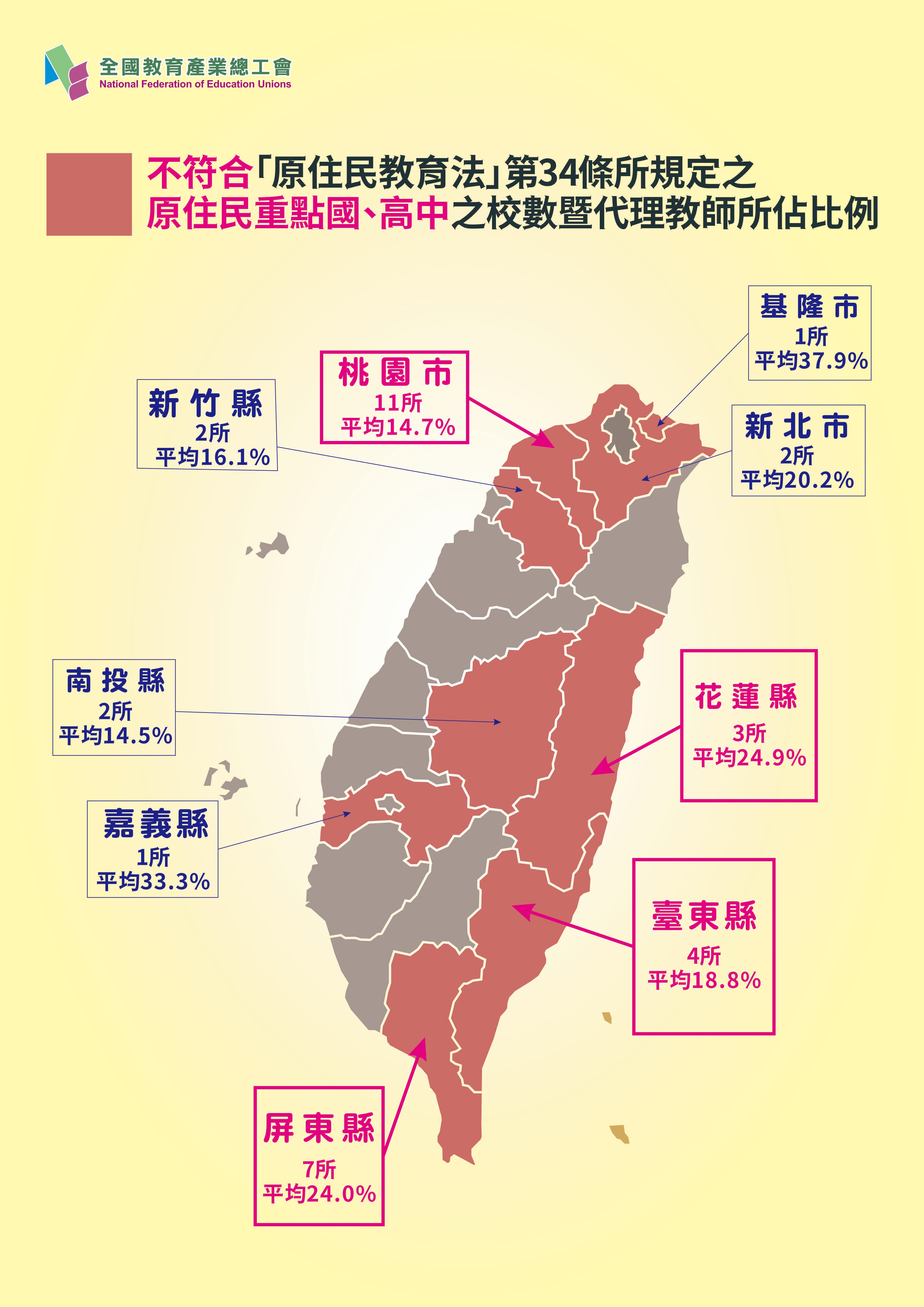 不符「原住民族教育法」34條規定的原住民重點國高中有35所:計桃園市11所、屏東縣9所、臺東縣4所、花蓮縣3所、新北市2所、南投縣2所、基隆市1所、新竹縣2所、嘉義縣1所。這些原住民重點國高中之代理教師比例平均分別為:基隆市37.9%、嘉義縣33.3%、花蓮縣24.9%、新北市20.2%、臺東縣18.8%、新竹縣16.1%、桃園市14.7%、南投縣14.5%、屏東縣14.4%。