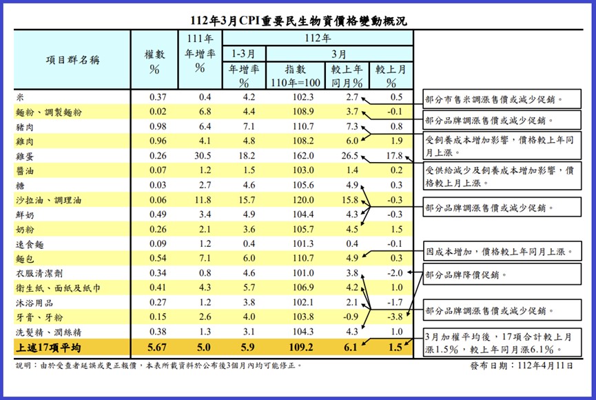 111年1月至今,消費者物價指數年增率111年2.95%,112年至3月2.35%,兩者累計已達5.3%。重要民生物資價格變動111年至112年3月累計更已達10.9%。面對物價高漲,調薪已是必然。