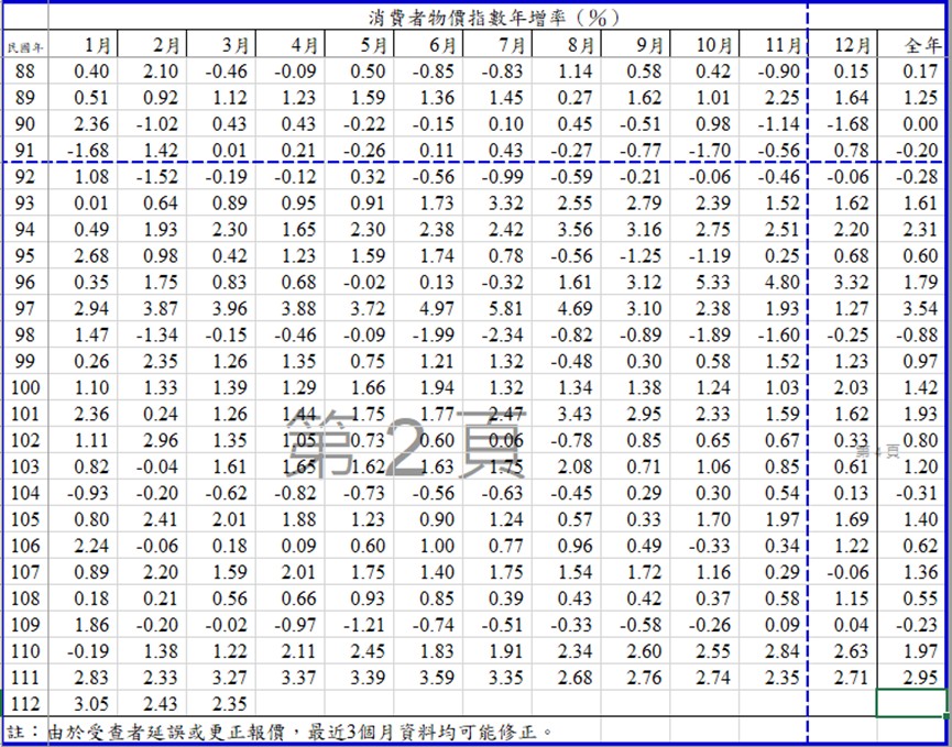 行政院網頁之總體經濟指標,物價方面111年受到俄烏戰爭僵持、極端氣候影響,國際原油及原物料價格大幅上漲,致全年消費者物價指數CPI年增率為2.95%;核心物價(剔除蔬菜、水果及能源後的總指數)上漲2.61%。