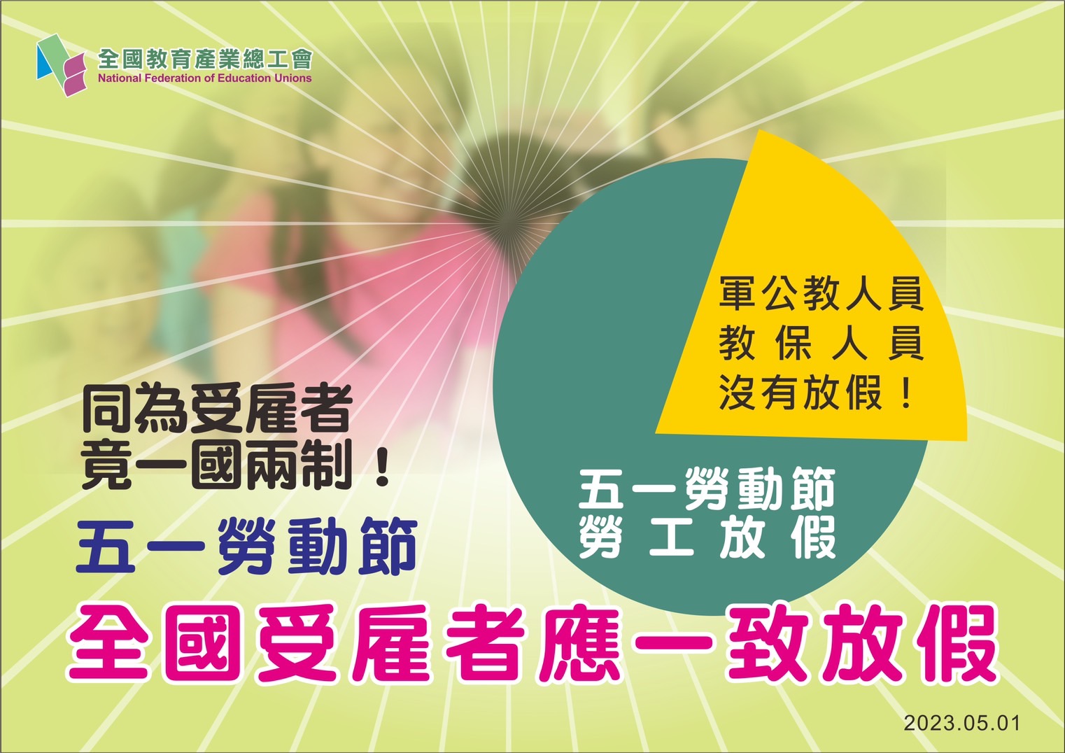 全教產呼籲立法委員推動修法:五一勞動節全國放假一天,不要再出現勞動節放假有「一家兩制」,避免變相懲罰有孩子的勞工父母之怪異現象,讓全國受僱者享有更好更優質的勞動條件。