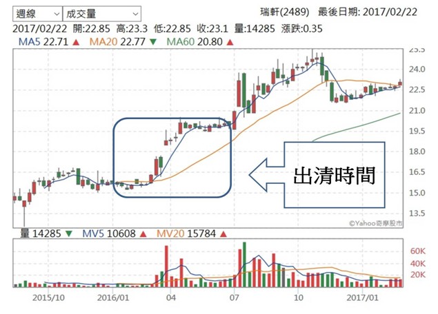 在2016年出清的股票中,本聯盟研究小組發現,瑞軒和台玻的出清十分不尋常。瑞軒是一支穩定獲利的股票,股價也呈上漲之勢(圖2),為何要選在那個時間點出清而不是等待更高的獲利?更值得注意的是,在退撫基金出清該股票後不久,該公司就發佈了重大利多,造成該股票持續上漲。只可惜,退撫基金已錯過這次的賺錢機會,造成委託人退休金的損失。