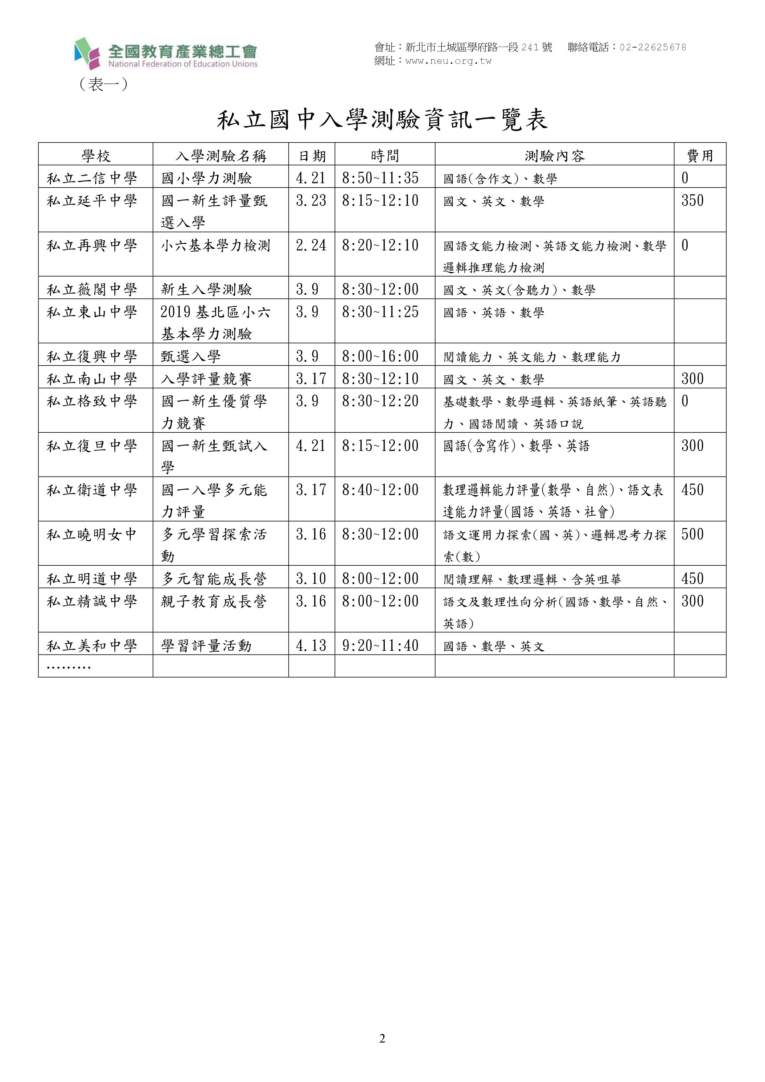 自103年開始推動「十二年國教」開始,面對不確定的教育改革,家長、學生無所適從,只好在混亂中想辦法找尋出路。邊做邊改的「十二年國教」,課綱、教材不斷變動,加上號稱「免試入學」、各高中職學校卻仍以會考成績做為參考的升學制度,更讓家長感到焦慮。私立中學對外打著「國、高中一貫」、「強調課業要求」、以及「生活常規的建立」等口號,使得家長趨之若鶩。於是各地私立學校便趁此風潮,以「報名人數」太多為藉口開辦各種科目的升學考試(見表一)。民國57年後免試的「九年國教」成為過去,更多的是社經背景好的父母將孩子送補習班,只為了能爭取私立國中的名額。