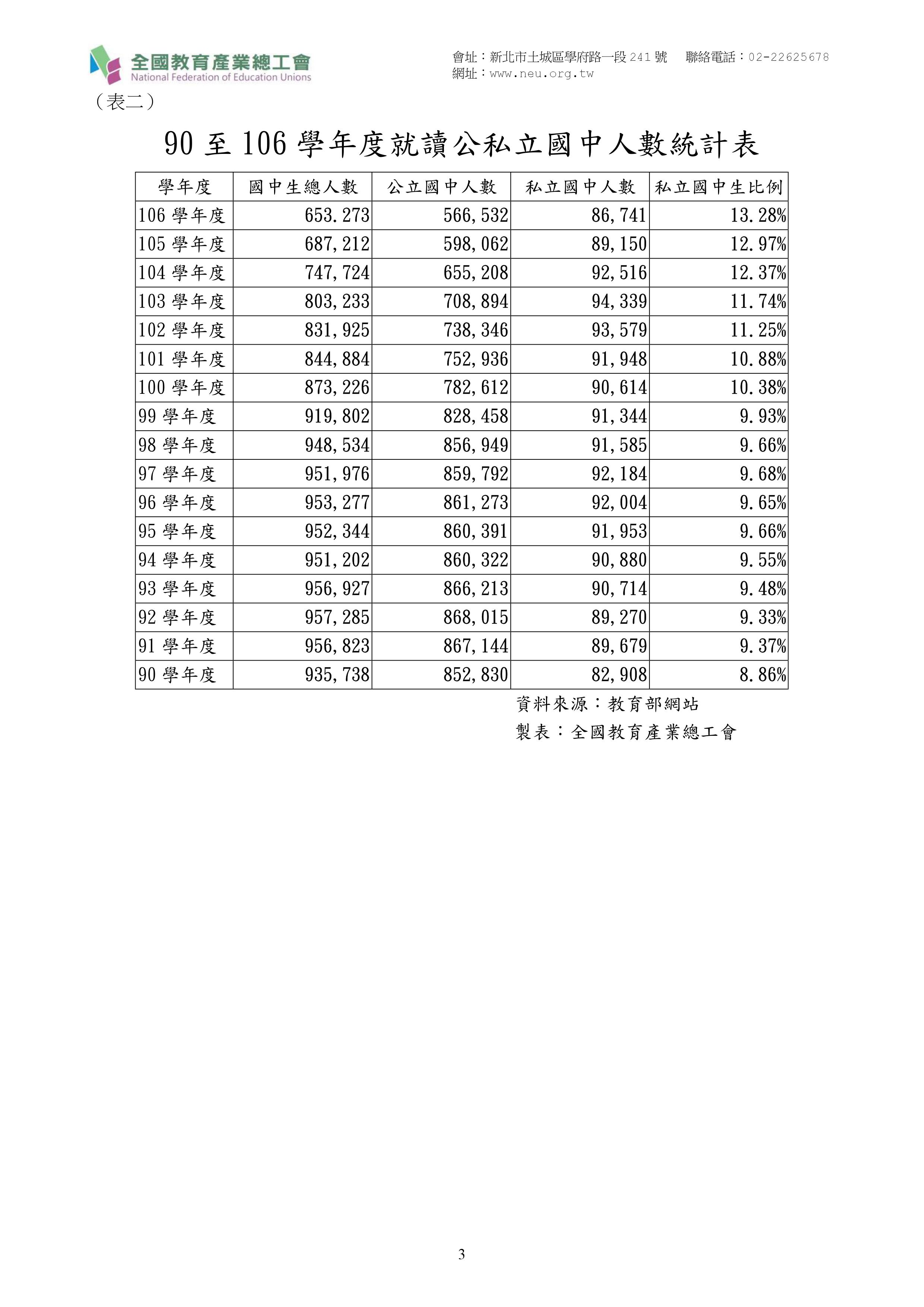 另外,自99學年度開始,搶進私立國中的人數便開始攀升,在少子女化的台灣,許多公立學校大嘆招生不足時,就讀私立國中的比例卻逆勢上揚(見表二),也足見家長對於教育部這幾年來一連串的「教育改革」沒有任何信心。然教育部卻漠視此一現象,不僅繼續推動迄今混亂的「108課綱」;更放任各私中違法用各種名義的招生考試、甚至收取報名費用。身為教育最高行政長官,不思如何開辦讓家長、學生更放心更有利的教育政策;卻放任國內私校違法招生,是怠忽職守。【全教產】在此呼籲教育部,請好好擔負起教育部應有之責任。「教育是百年大計」,邊做邊改、譁眾取寵的教育政策,只會讓家長更灰心,此非台灣教育之福、非學子之福。