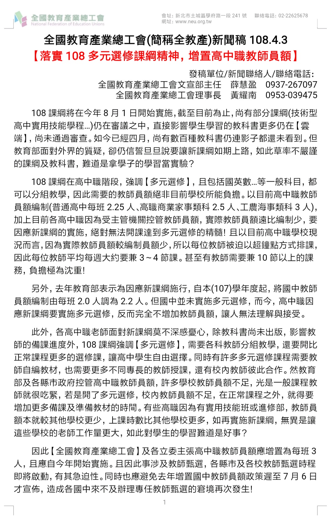 2019-04-03【全教產新聞稿】落實108多元選修課綱精神,增置高中職教師員額