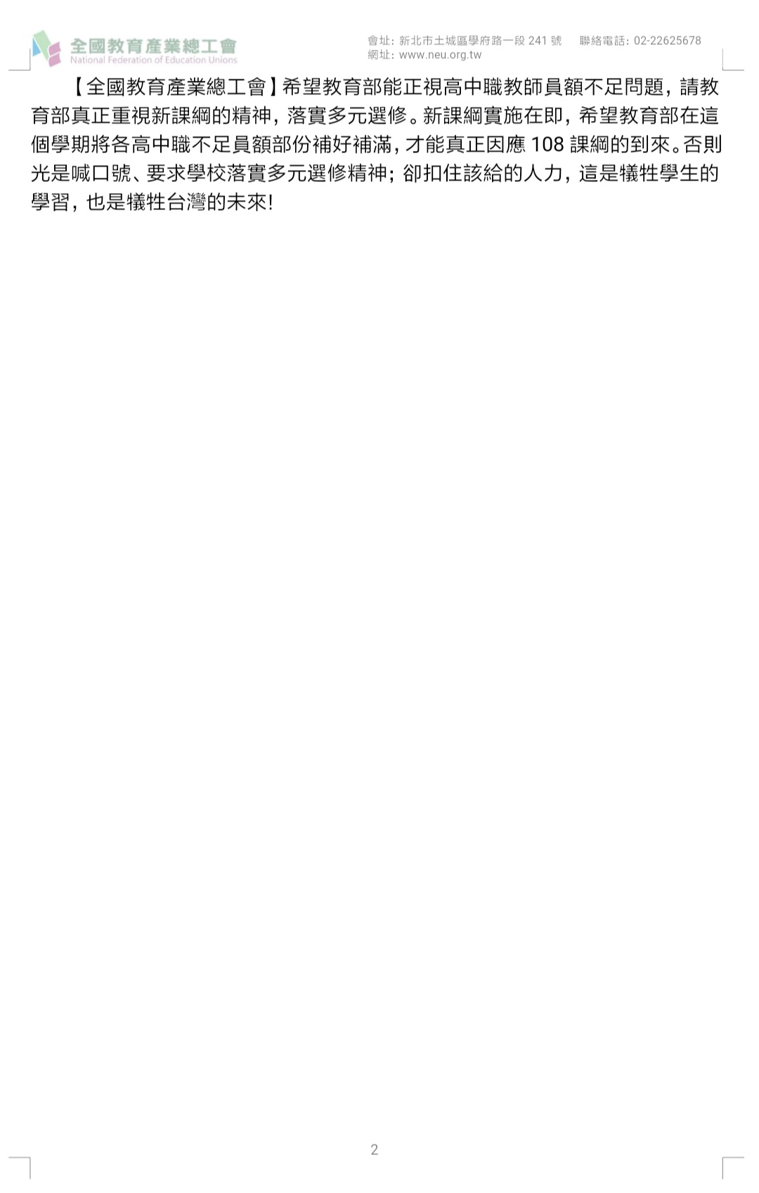【全教產新聞稿】落實108多元選修課綱精神,增置高中職教師員額
