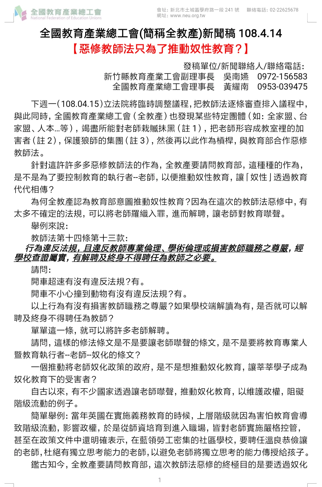 2019-04-14【全教產新聞稿】惡修教師法只為了推動奴性教育?