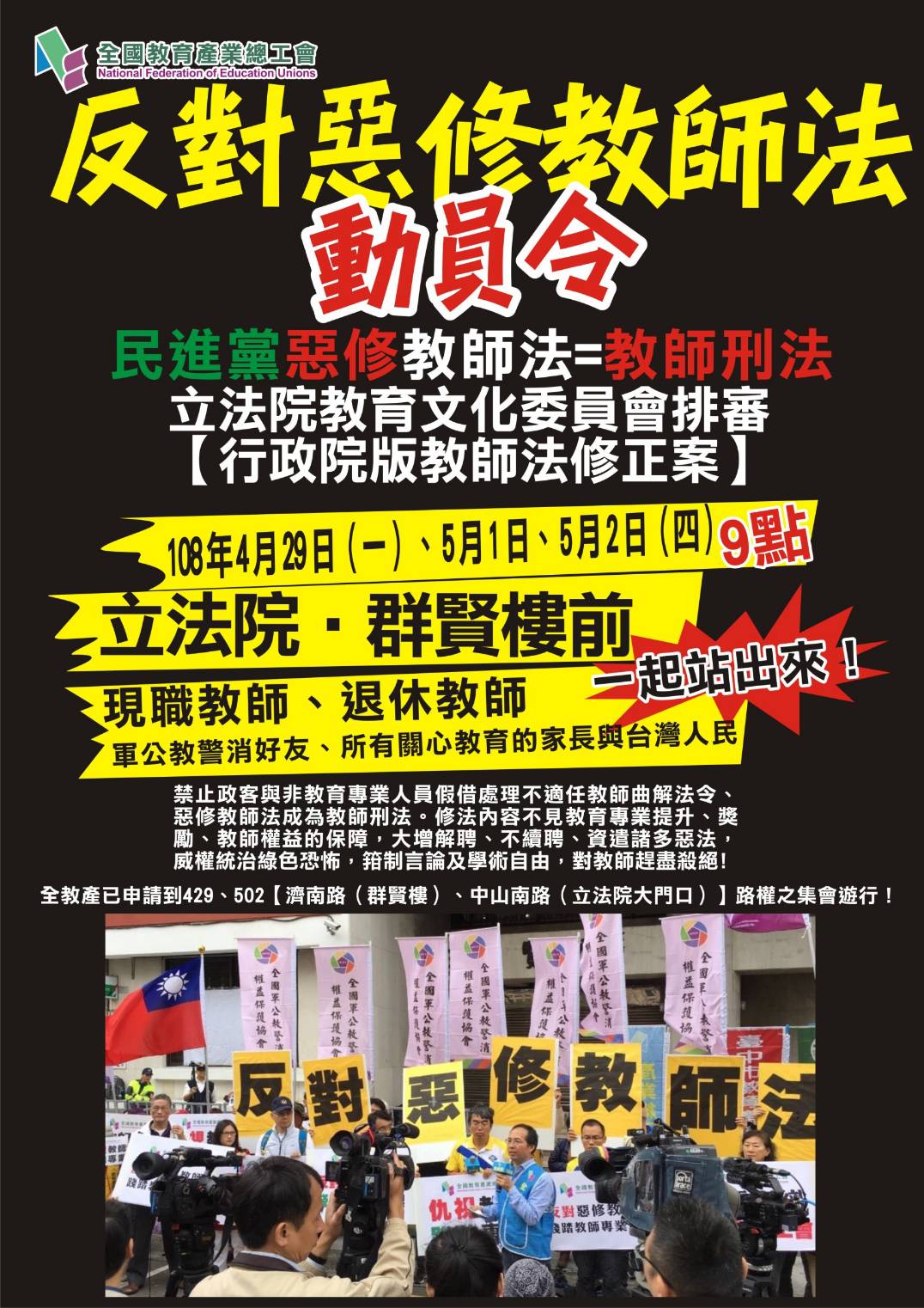 2019-04-25【全教產新聞稿】429, 51-52反對惡修教師法動員令,歡迎大家踴躍參加聲援