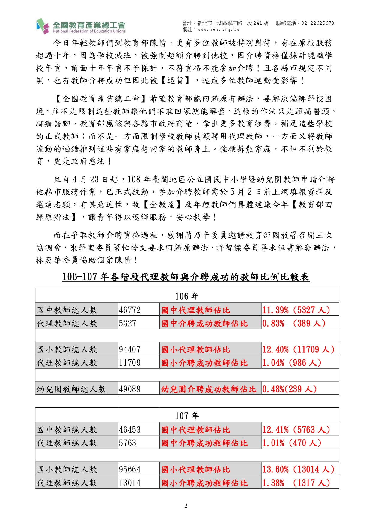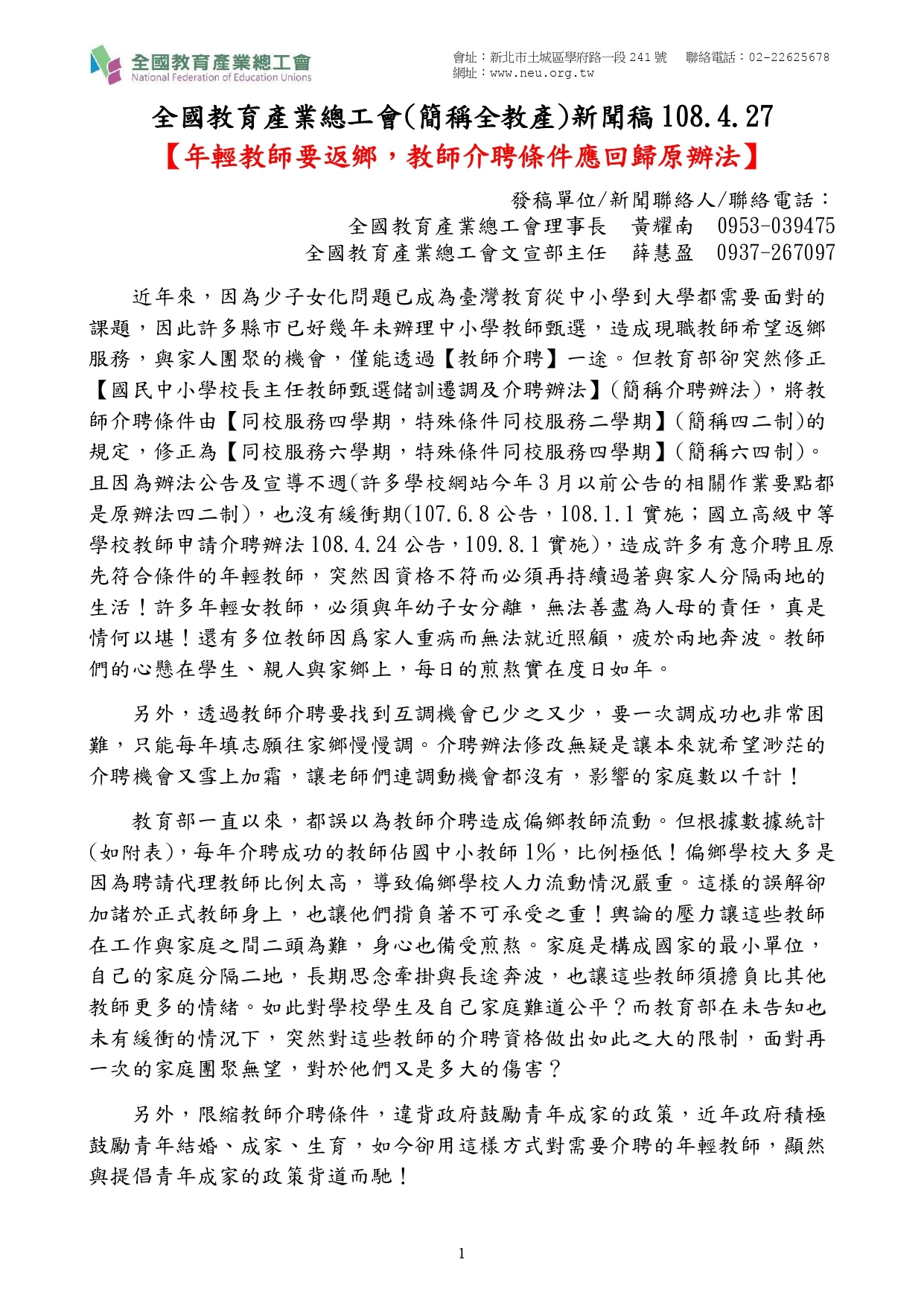 2019-04-27【全教產新聞稿】年輕教師要返鄉,教師介聘條件應回歸原辦法