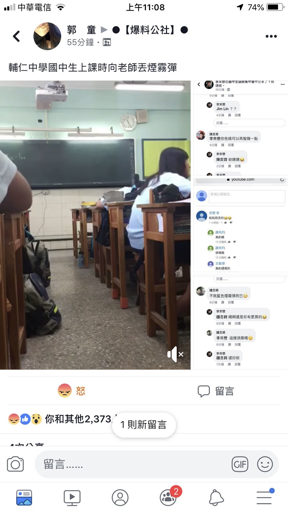 昨早在臉書【爆料公社】有一則貼文,是某國中的上課情況。老師在黑板前認真上課,底下聽課的某一個學生冷不防地丟了一個冒著濃煙的煙霧彈,把老師嚇了一跳,而其他同學則是嬉鬧奔跑,完全沒有上課的樣子。