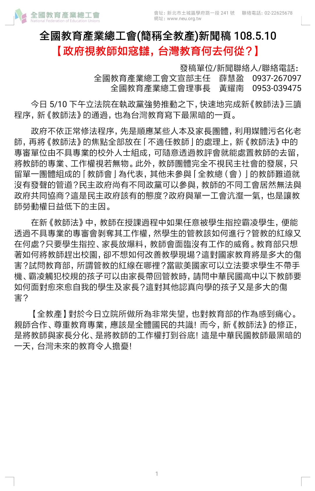 2019-05-10【全教產新聞稿】政府視教師如寇讎,台灣教育何去何從?