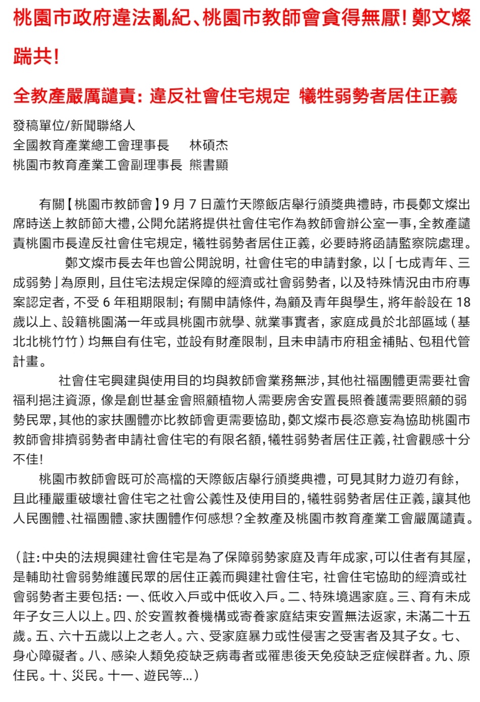 2019-09-09【全教產新聞稿】桃園市政府違法亂紀、桃園市教師會貪得無厭!鄭文燦踹共!全教產嚴厲譴責:違反社會住宅規定 犧牲弱勢者居住正義